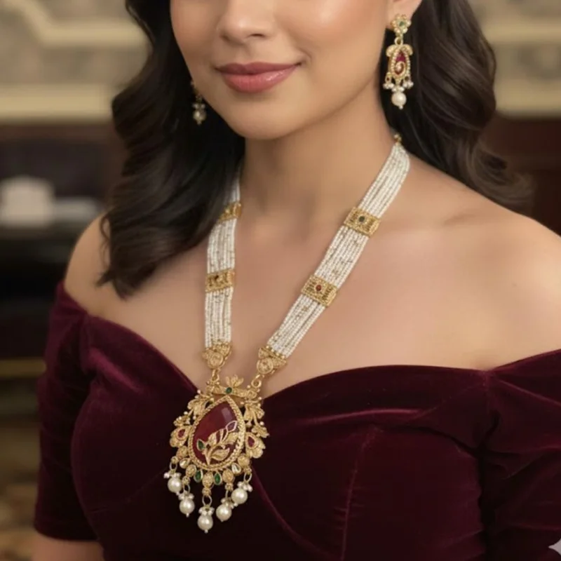 Grand Design: A classic “Rani Haar” (Queen’s Necklace) style featuring a bold, statement pendant and multi-strand pearls.