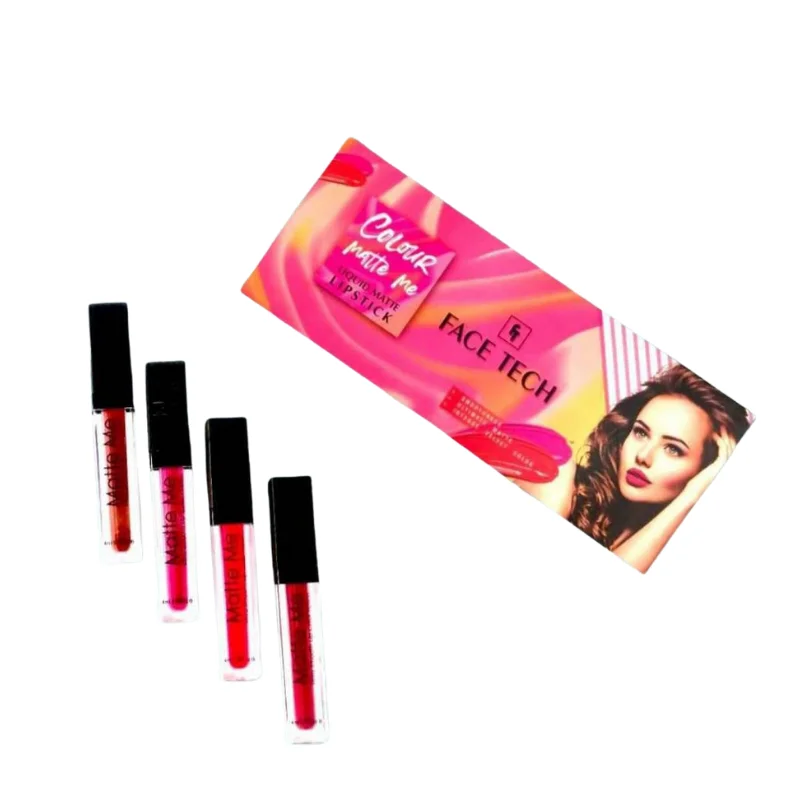 The product consists of a set of four liquid matte lipsticks, presented alongside their vibrant and eye-catching retail packaging. The individual liquid lipsticks come in slender, clear tubes with black caps, allowing the color of the product inside to be visible. The words “Matte Me” are printed vertically on the side of each tube. The main packaging is a rectangular box, predominantly pink and orange with dynamic wavy patterns. It prominently features a graphic of a woman with full, red lips, illustrating the product’s effect. The brand “FACE TECH” is clearly displayed, along with “COLOUR MATTE ME” and “LIQUID MATTE LIPSTICK.” Additional text on the packaging likely details ingredients, shades, or usage instructions. The overall aesthetic is bold and trendy, appealing to users looking for highly pigmented, matte lip color.