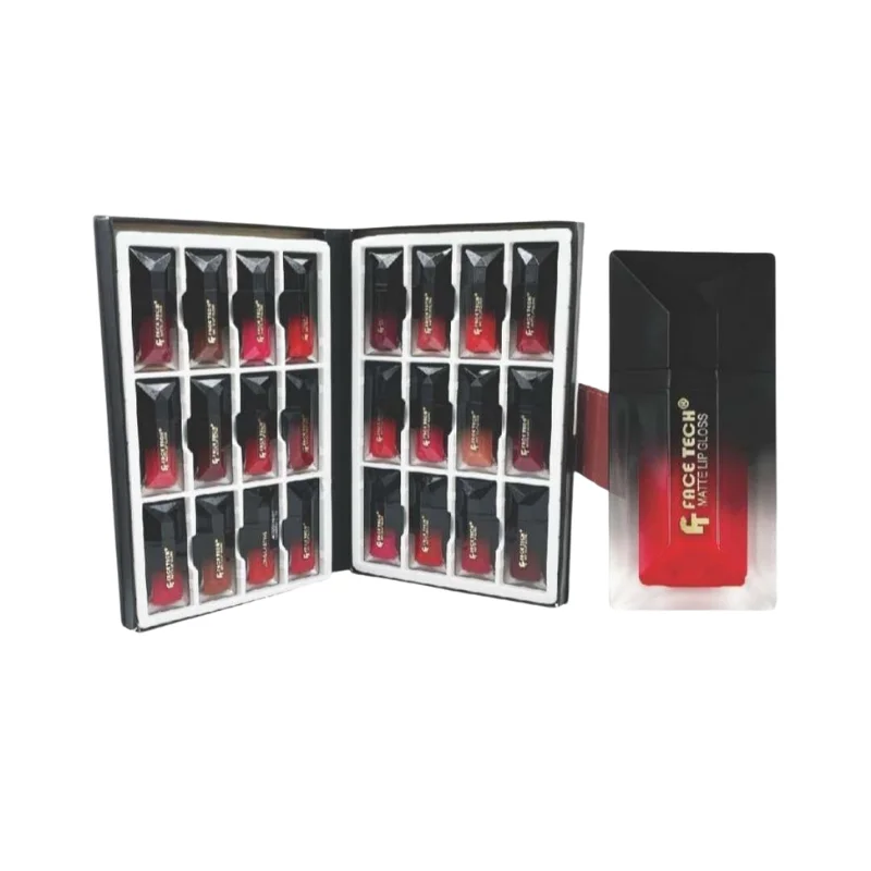 The product features a collection of 24 matte lipglosses, housed in a sophisticated black case that opens like a book, revealing two columns of lipglosses on each side. The lipglosses themselves are in sleek, rectangular bottles with a black top and a clear bottom that showcases the individual lipgloss color. The “FACE TECH®” brand name and “MATTE LIPGLOSS” descriptor are visible on the side of the individual packaging. The set offers a variety of shades, ranging from nudes and pinks to deeper reds, providing options for different preferences and occasions. The design of the packaging suggests a premium or gift-worthy item.