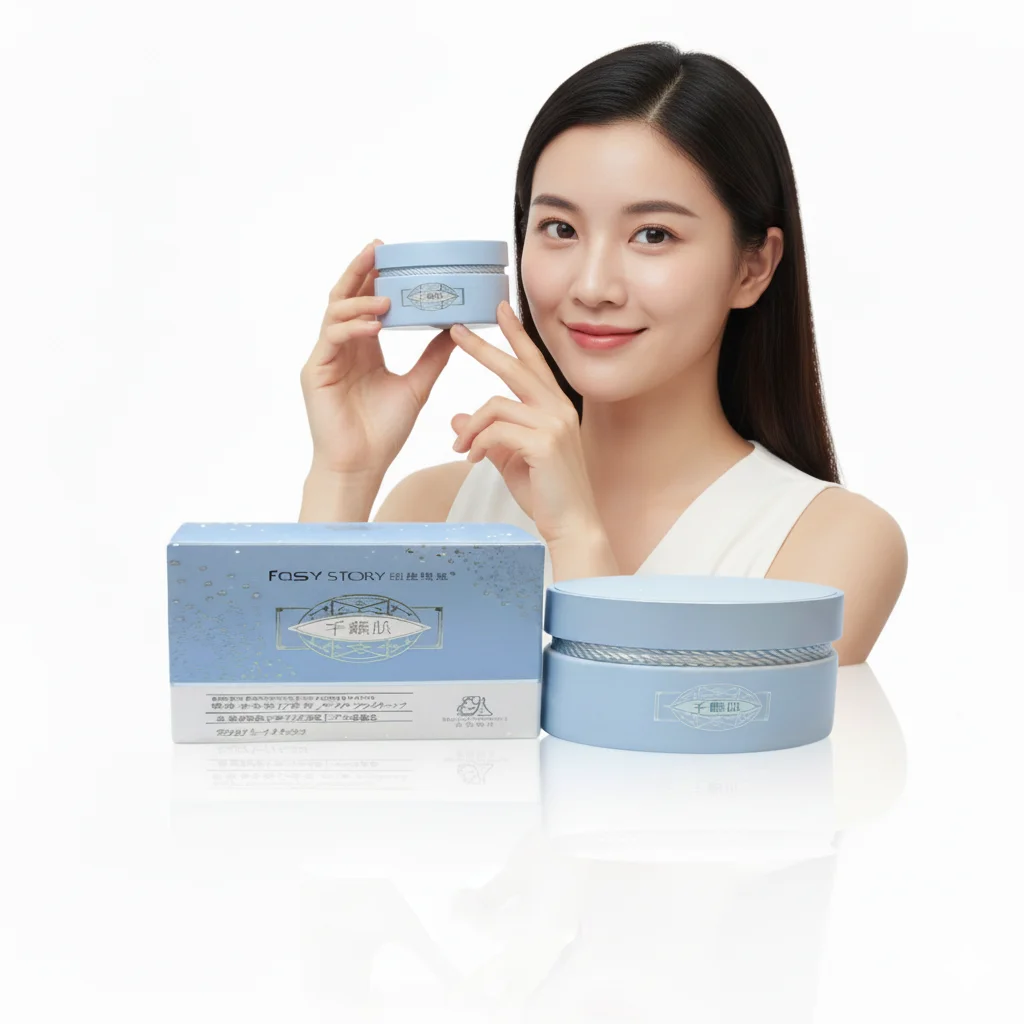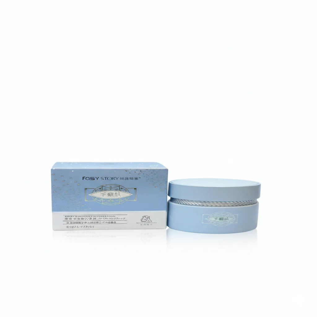 This cream is presented in a light blue jar and matching box with silver accents. The brand name, “FASY STORY,” is prominently displayed on the packaging. The product name, which translates to something akin to “Lush and Condensed Skin,” suggests its intended purpose for skin nourishment and care. The packaging also includes the phrasebright which means “Bright Moon Seaweed,” indicating that seaweed extract is a likely key ingredient.
