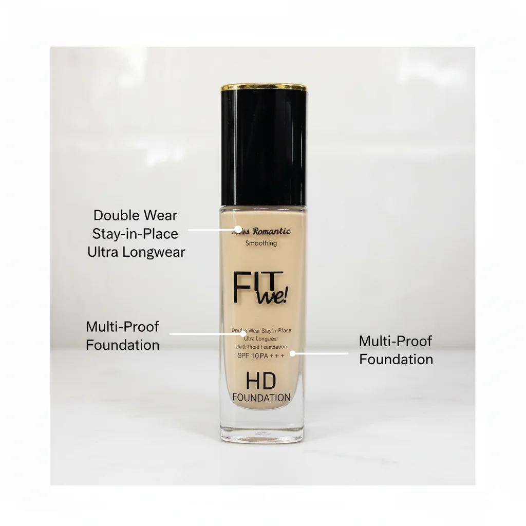 The Miss Romantic Fit Me! HD Foundation Be Glow is a liquid foundation presented in a sleek, transparent glass bottle