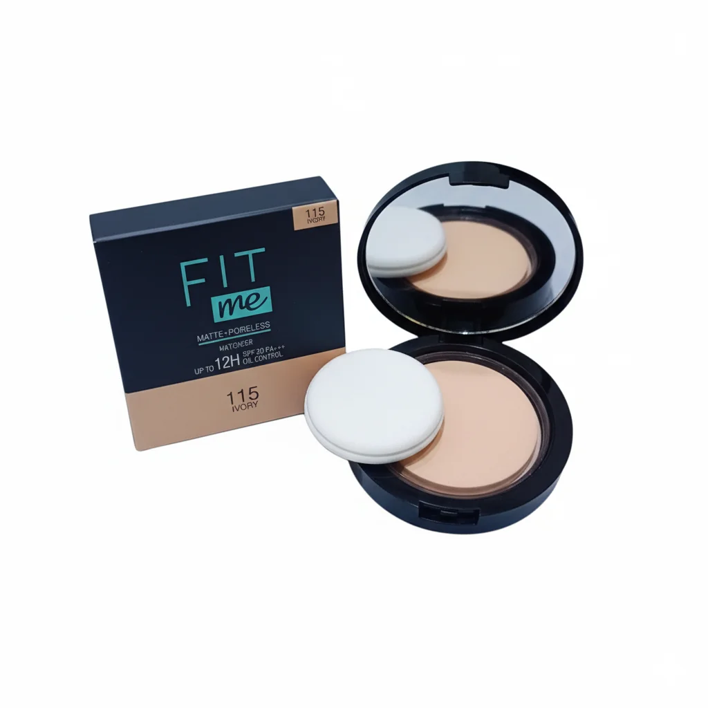 The Fit Me Matte + Poreless Powder is a compact powder designed to provide a matte finish and control oil for up to 12 hours. It’s specifically formulated to minimize the appearance of pores, offering a smooth and poreless look. This particular product is in shade 115 Ivory, a light shade suitable for fair skin tones. The compact includes a mirror for on-the-go application and a soft applicator sponge. It also boasts SPF 20 PA+++, providing a good level of sun protection. The packaging consists of a sleek black compact with a clear cover over the powder, and it comes in a black and beige cardboard box that clearly displays the brand, product name, and shade information.