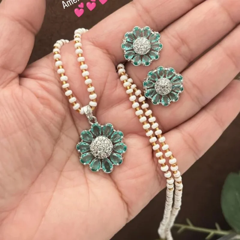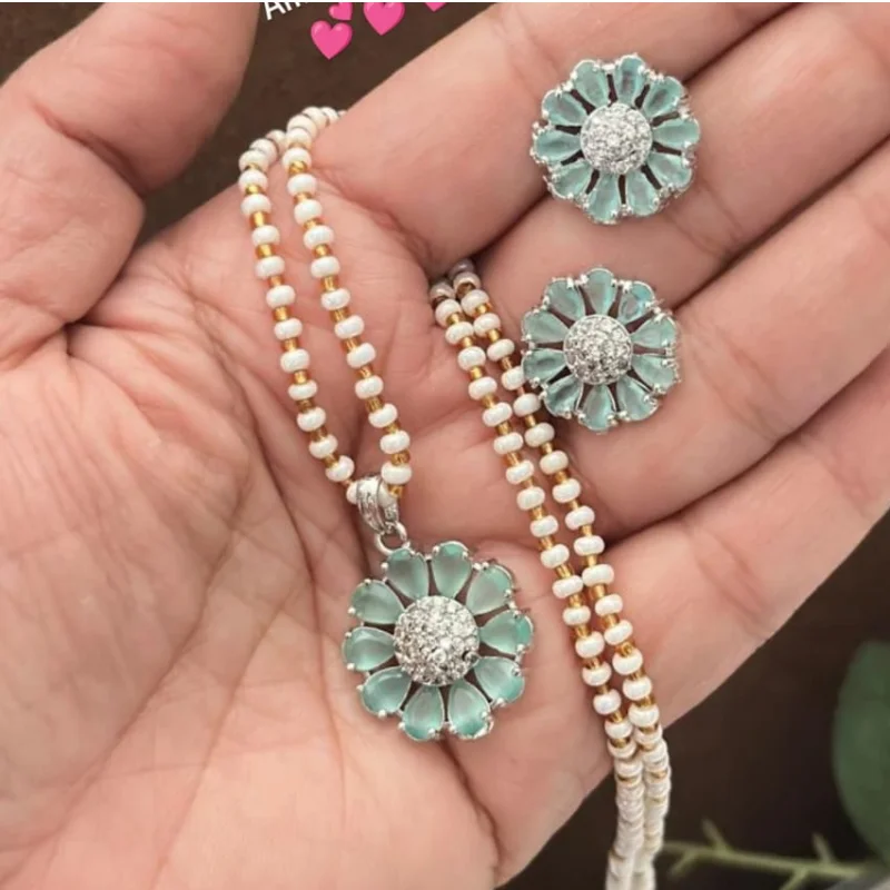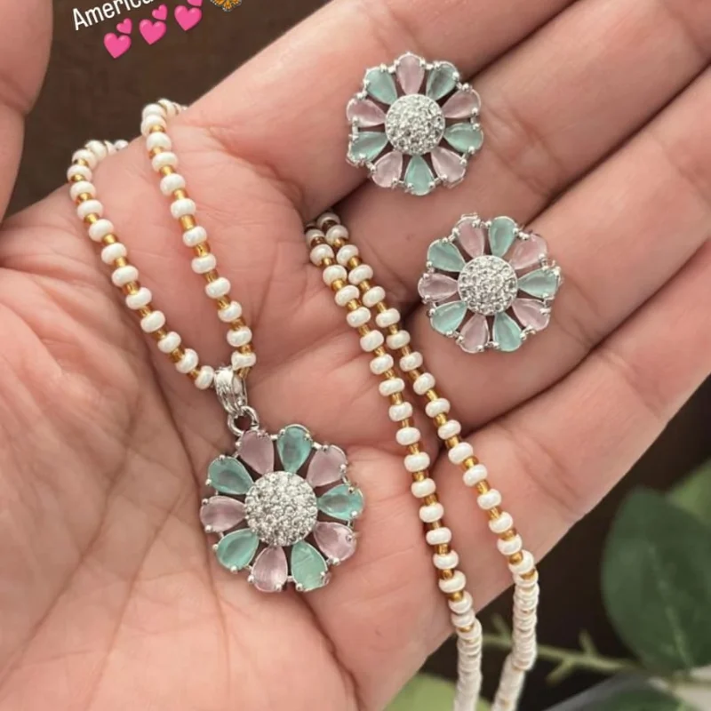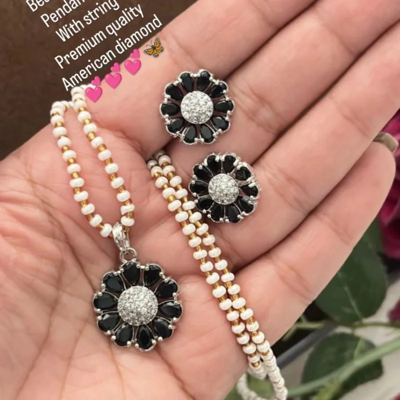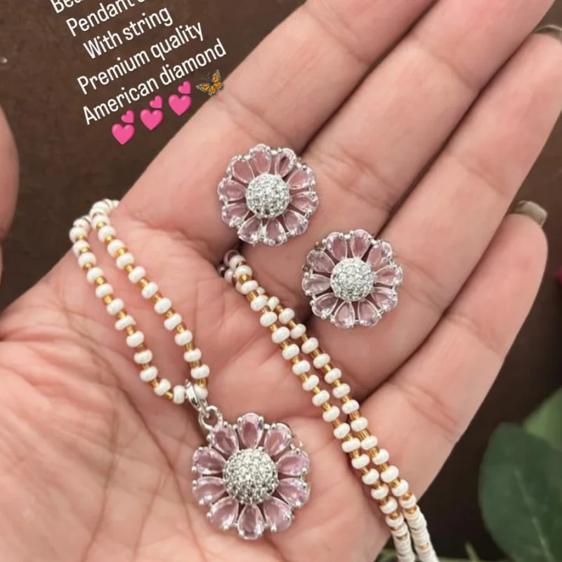 Hued American Diamond (AD) Stud Earrings & Crystal Beaded String Combo Set