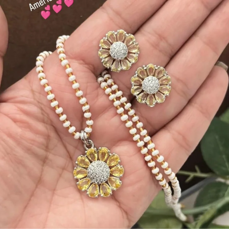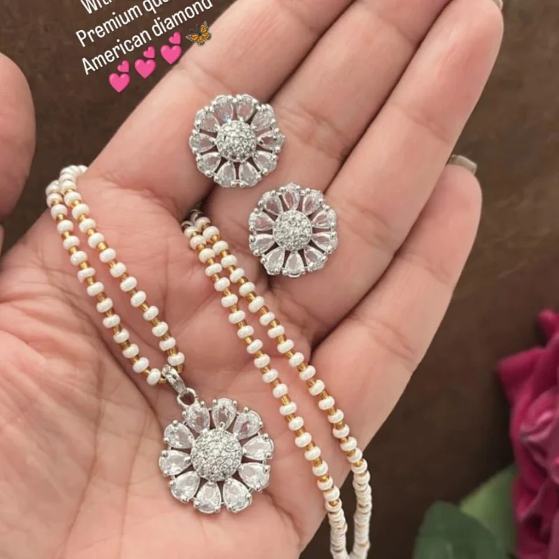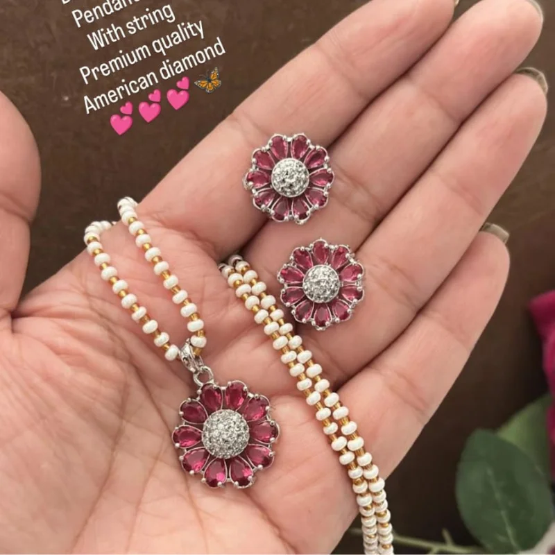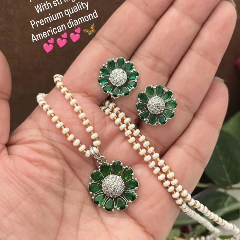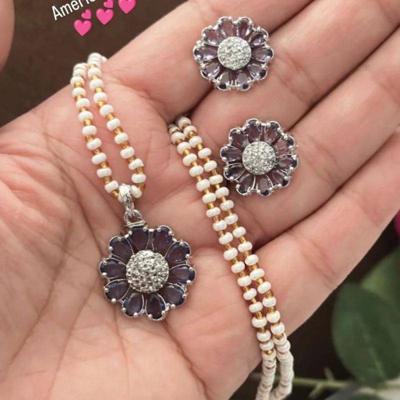 Hued American Diamond (AD) Stud Earrings & Crystal Beaded String Combo Set