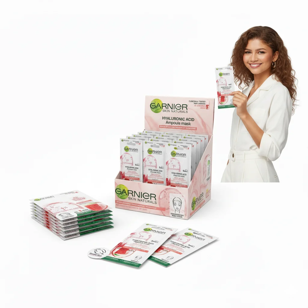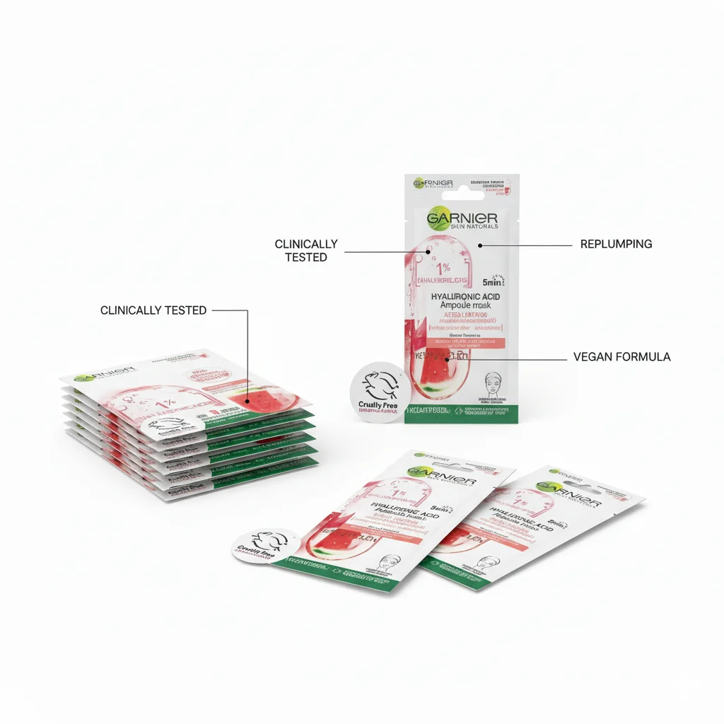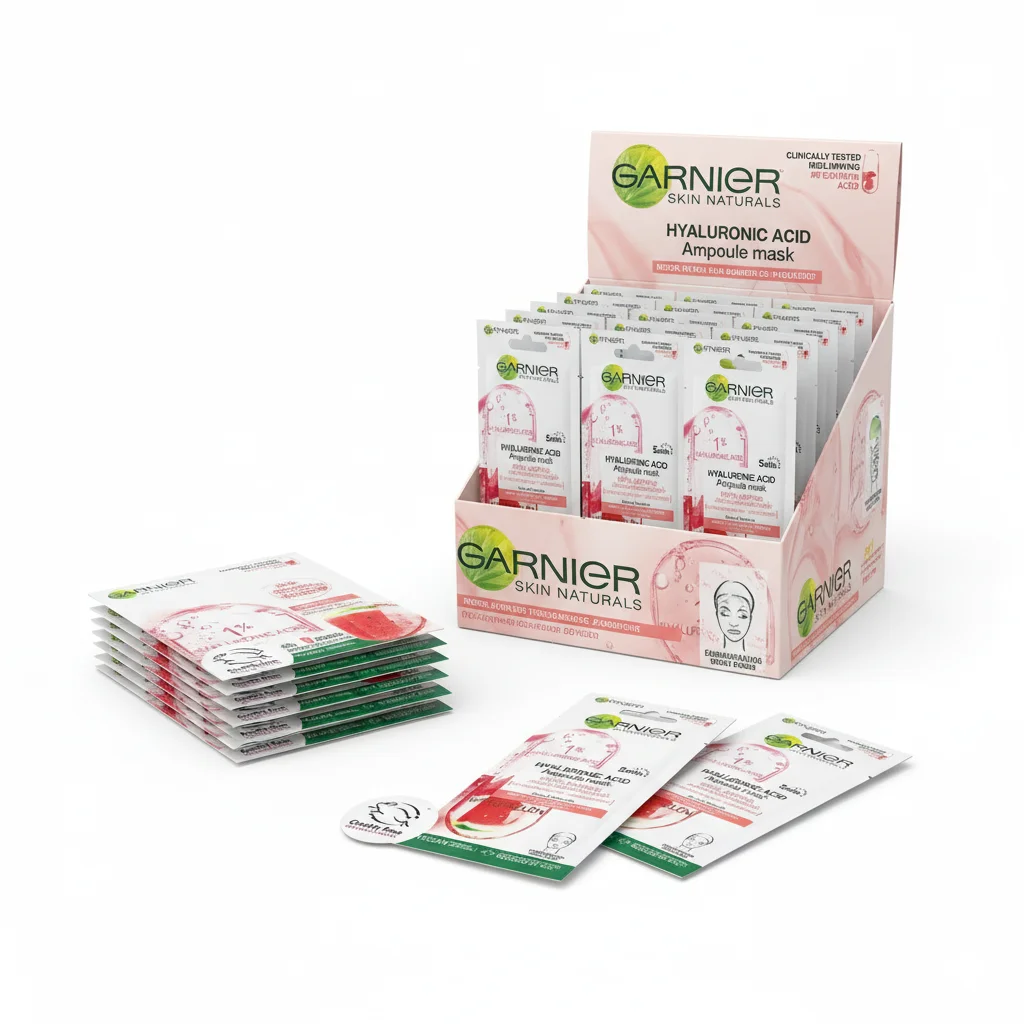 This image displays a retail presentation of the Garnier Skin Naturals Hyaluronic Acid Ampoule Mask, specifically the “Watermelon” variant. The product is designed as a sheet mask, intended for skin hydration and revitalization. It’s packaged in individual sachets, prominently featuring the Garnier logo and branding, “Skin Naturals.” The primary active ingredient highlighted is Hyaluronic Acid, known for its intense moisturizing properties. The “Ampoule Mask” designation suggests a concentrated formula. The “Watermelon” indicator, visible on the individual sachets, implies the inclusion of watermelon extract for added benefits like refreshment or a pleasant scent.