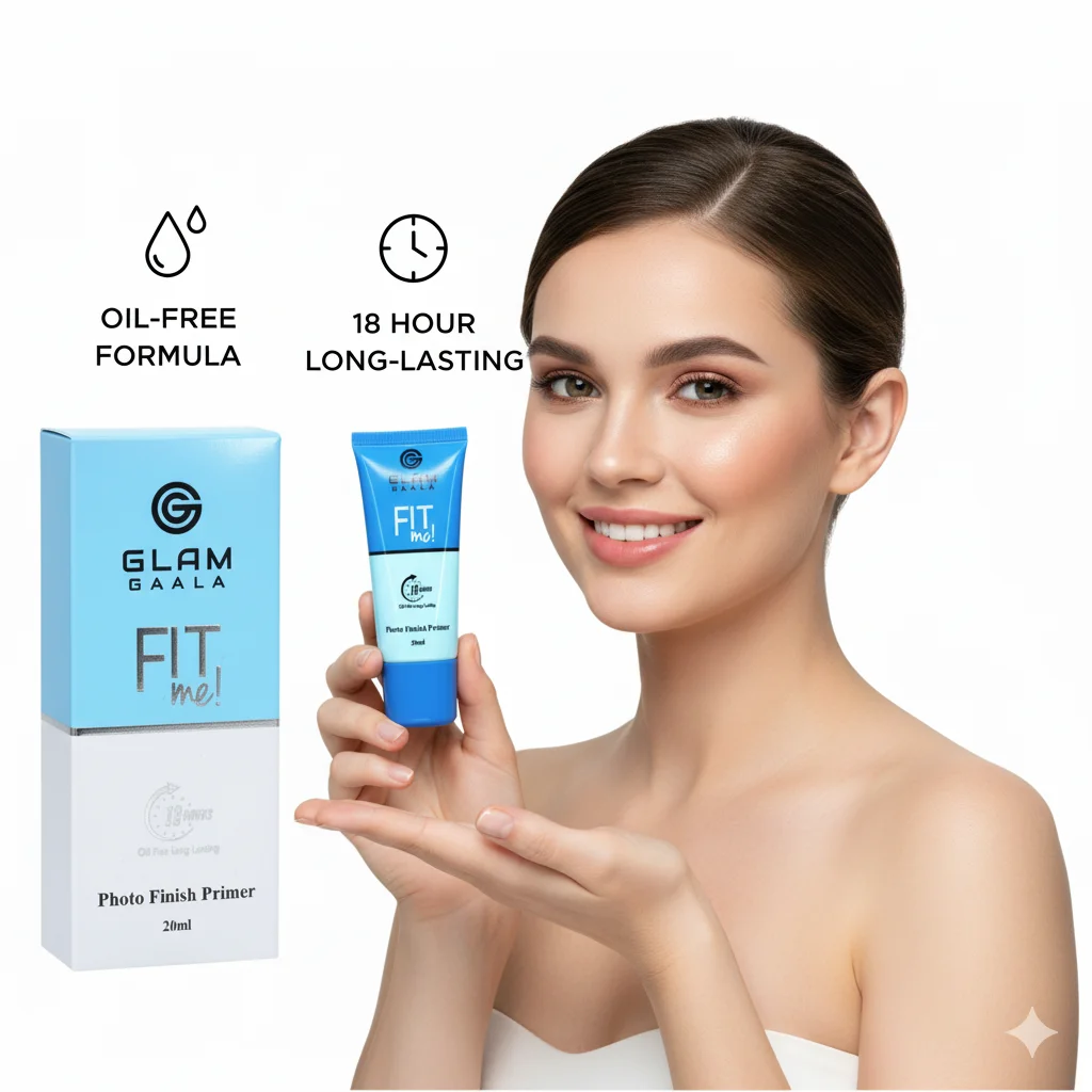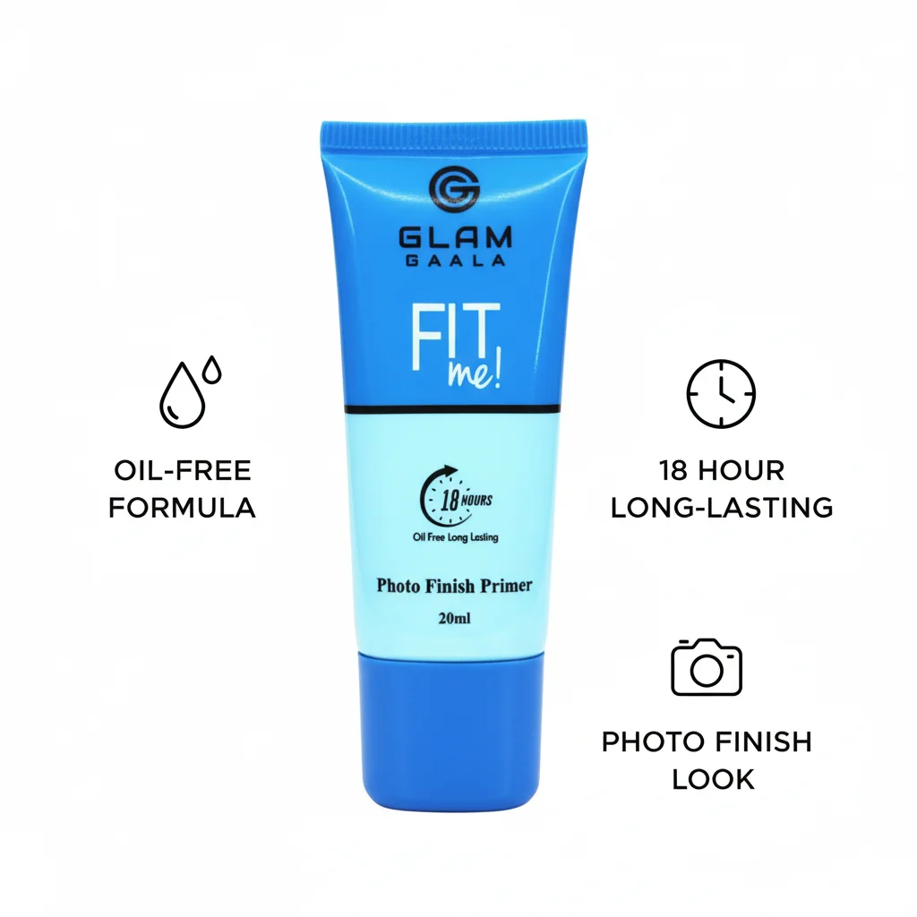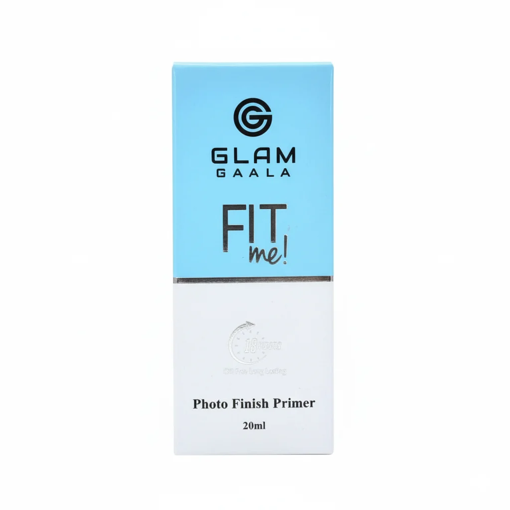 The sleek packaging features a refreshing sky-blue upper half with the “Glam Gaala” logo and the bold “FIT me!” slogan, suggesting a product that adapts well to individual skin needs. The lower white section reiterates “Photo Finish Primer” and the “20ml” volume, along with a clock icon emphasizing its long-lasting capabilities. This primer acts as a barrier between your skin and makeup, helping to prevent makeup from settling into fine lines or pores, and creating a comfortable, weightless feel. It’s an ideal choice for anyone looking to enhance their makeup’s longevity and achieve a professional, polished look.