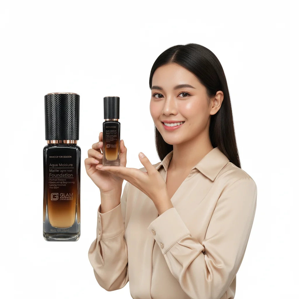 The GLAM GODDESS Aqua Moisture Matte Foundation is designed to provide a “Perfect Flawless” look with a “Moisturising Brightening Lasting Makeup” finish. It comes in a stylish bottle with a textured black cap and rose gold accents, alongside a complementary box. The foundation itself appears to have a gradient of shades, suggesting it might adapt to various skin tones or be available in different shades. The packaging highlights “Aqua Moisture” and “Matte Light & Moist” properties, indicating a formula that aims to offer both hydration and a non-shiny, natural-looking finish. It is presented as a “MAKE UP FOR SEASON” product, suggesting its versatility. The net weight is 25ml.
