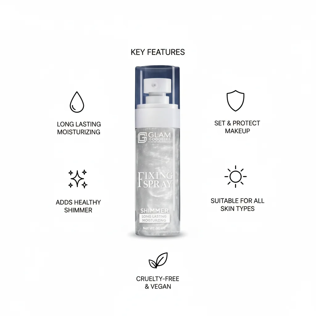 The GLAM GODDESS Shimmer Fixing Spray is an innovative makeup setting spray designed to not only extend the wear of your makeup but also impart a subtle, radiant shimmer to your skin. Formulated to be long-lasting, it helps keep your makeup in place throughout the day, preventing smudging, fading, and creasing. Beyond its fixing capabilities, this spray also boasts moisturizing properties, ensuring your skin remains hydrated and comfortable, avoiding the dry or tight feeling often associated with some setting sprays. The “Shimmer” aspect suggests it contains fine, light-reflecting particles that give a luminous, dewy finish, perfect for adding a touch of glamour to any look. It comes in a sleek, pump-spray bottle for easy and even application.
