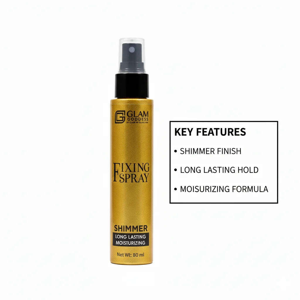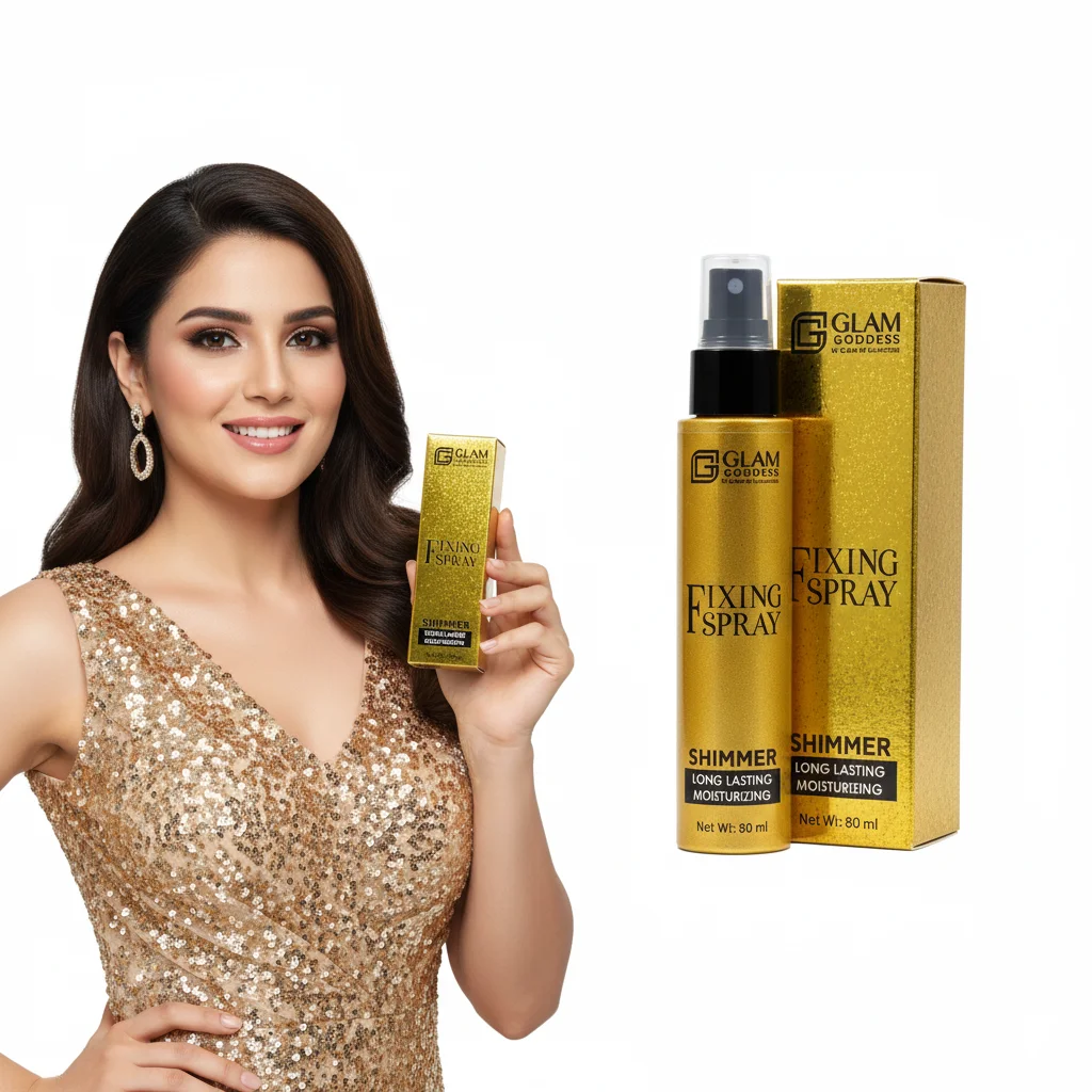 Drench your skin in a luxurious glow with the Glam Goddess Shimmer Fixing Spray, now in a dazzling gold edition. This exquisite fixing spray is designed to not only set your makeup for exceptionally long-lasting wear but also to infuse your complexion with a captivating, golden shimmer. The fine, reflective particles create a radiant luminosity, perfect for adding a touch of glamour to any look. Beyond its stunning visual appeal, this spray is formulated with moisturizing properties, ensuring your skin remains hydrated and comfortable throughout the day without feeling sticky or heavy. The fine mist provides an even, weightless application, sealing your makeup flawlessly while delivering an undeniable, shimmering finish. Presented in an elegant 80ml bottle, this golden fixing spray is your ultimate tool for a radiant, enduring, and glamorous complexion.