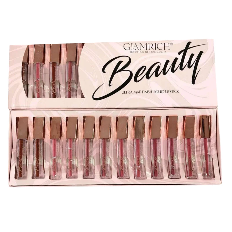 Experience the “Definition of Real Beauty” with the GLAMRICH Beauty Ultra Matte Finish Liquid Lipstick Set. This elegant collection features 12 individual liquid lipsticks, each designed to provide an impeccable “Ultra Matte Finish.” The sophisticated formula glides on smoothly, delivering intense color payoff with a luxurious, velvety texture that dries down to a perfectly matte look.