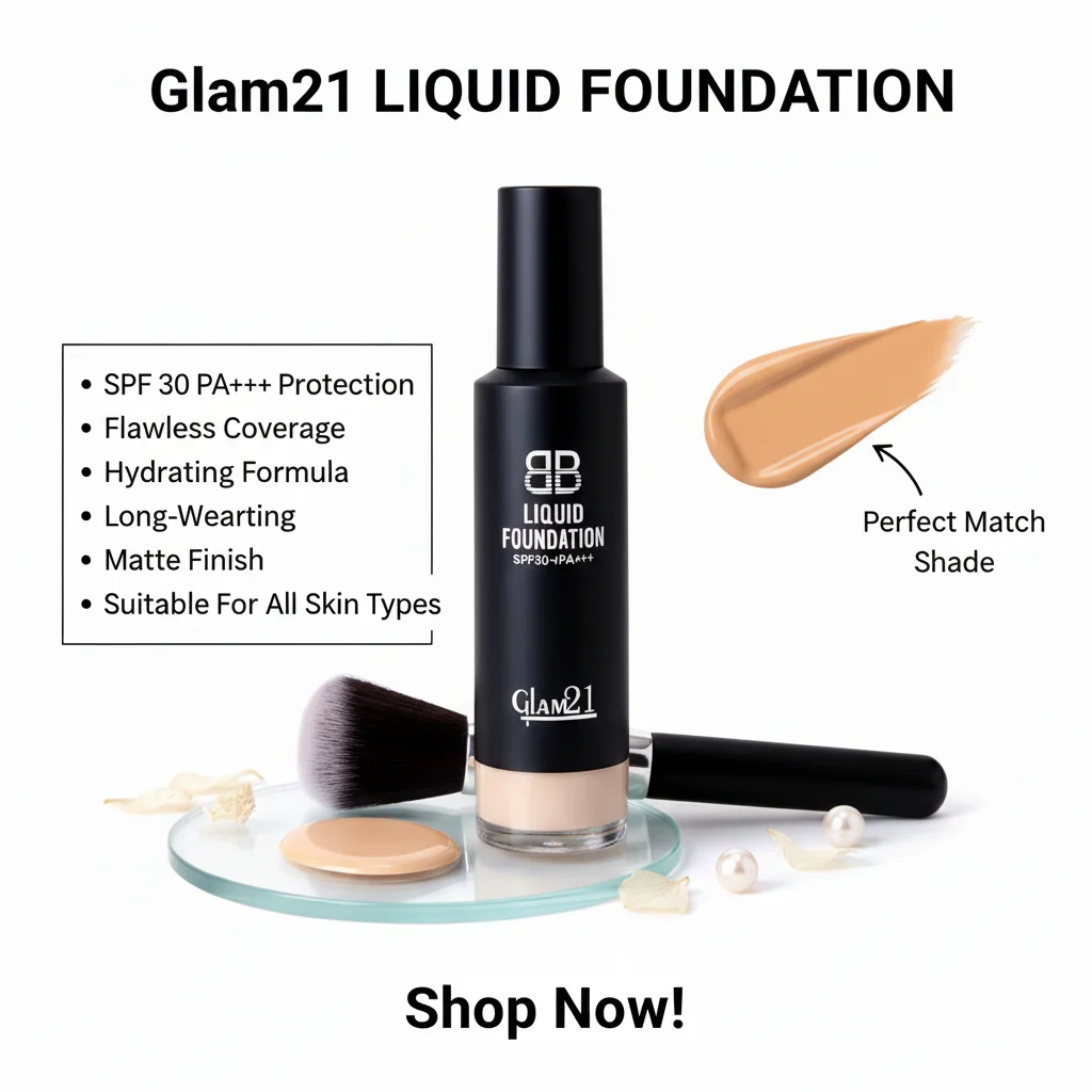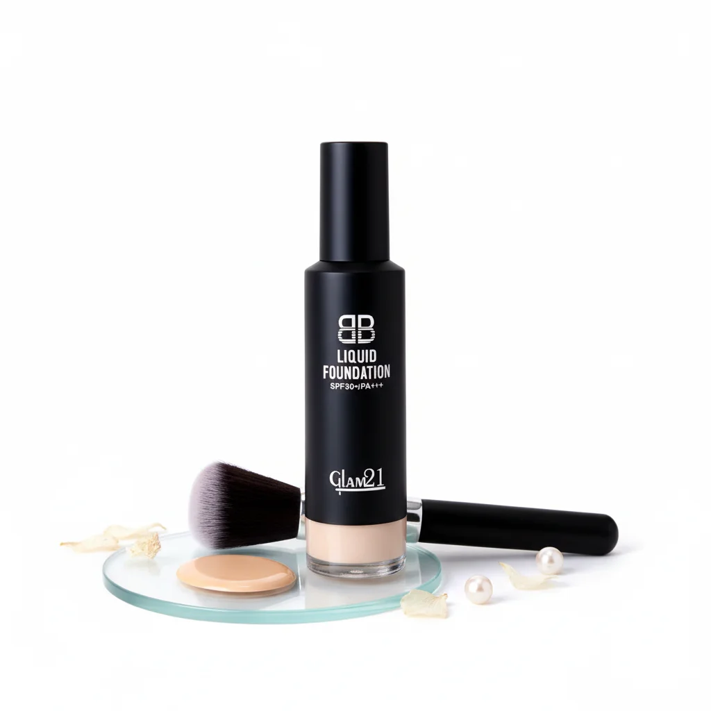 The Glam21 Liquid Foundation is presented in a sleek, matte black bottle with a minimalist design, indicating a sophisticated and modern aesthetic. The product name “LIQUID FOUNDATION” is clearly printed, along with the sun protection factor “SPF30 PA+++”, suggesting it offers moderate broad-spectrum UV protection. The bottle features a pump dispenser, which is hygienic and allows for controlled product application, minimizing waste.