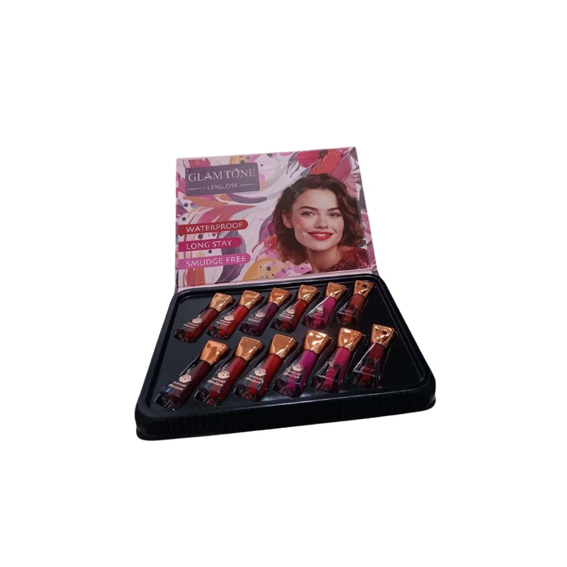 The Glamtone Lip Gloss set features a collection of lip glosses designed for long-lasting wear. The packaging highlights “WATERPROOF” and “LONG STAY” qualities, indicating its durability and resistance to smudging. The set includes multiple shades, suggesting a variety for different looks and preferences. The box features a smiling woman, implying the product aims to enhance beauty and provide a confident, radiant appearance. The lip glosses are neatly arranged in a black tray, making them visually appealing and organized.
