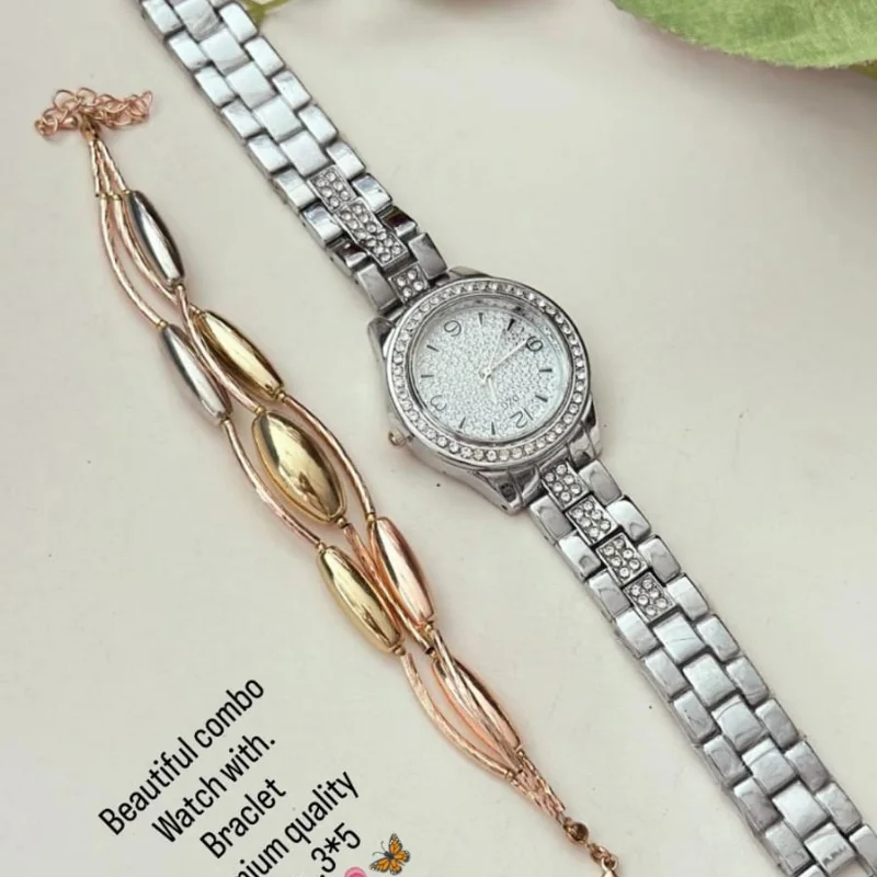 This is a “Beautiful combo” set of a premium quality ladies’ analog watch and a chic fashion bracelet. The duo blends dazzling crystal embellishments with a versatile multi-tone design, making it a perfect gift or a sophisticated addition to any jewelry collection.