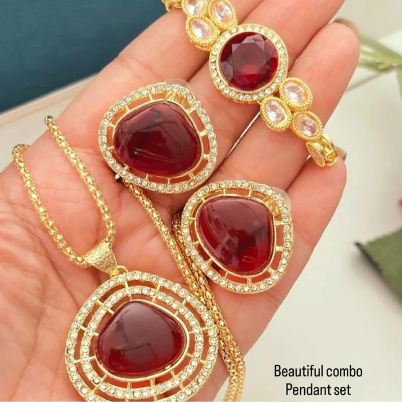 Gold-Toned Geometric Pendant Set with Chain, Matching Stud Earrings, and Designer Bracelet Combo