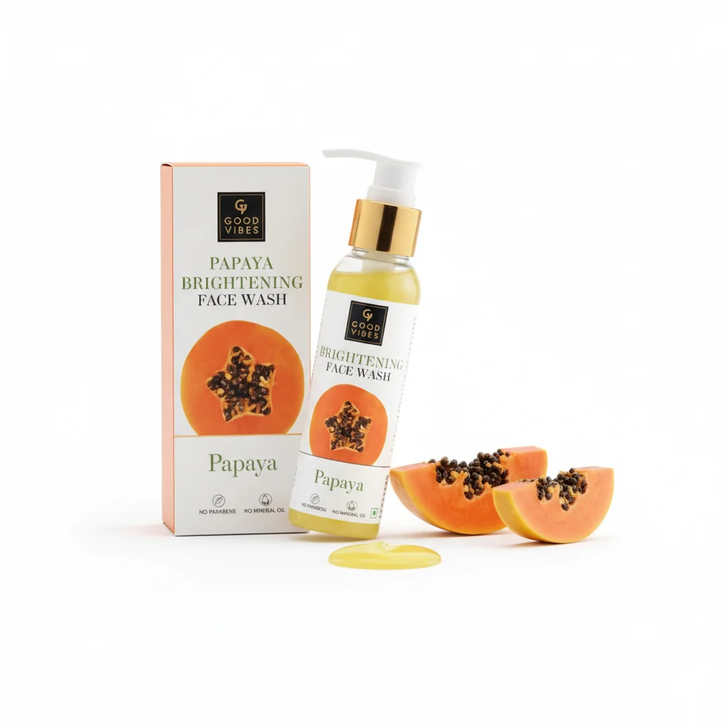 The Good Vibes Papaya Brightening Face Wash is a rejuvenating cleanser designed to enhance skin radiance and promote an even skin tone. Infused with the natural goodness of papaya, known for its skin-brightening enzymes like papain, this face wash gently exfoliates dead skin cells, helping to reveal a fresher, more luminous complexion. It effectively removes dirt, impurities, and excess oil without stripping the skin’s natural moisture, leaving it feeling clean, soft, and refreshed. The product is presented in an attractive bottle with a golden pump dispenser, ensuring easy and hygienic use. Both the bottle and the matching carton box feature vibrant illustrations of papaya, emphasizing its key natural ingredient. This face wash is carefully formulated to be free from parabens, mineral oil, and sulfates, making it a thoughtful choice for those seeking a gentle yet effective brightening solution. A radiant young woman is depicted in the background, holding a fresh papaya slice, reinforcing the product’s natural benefits and target audience.