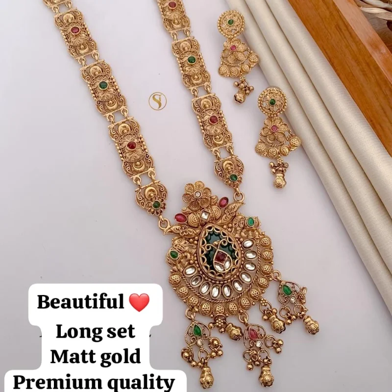 Radiate traditional elegance with this Premium Matte Gold Long Necklace Set, a perfect fusion of heritage design and modern craftsmanship. This “Haram” features a sturdy, majestic chain composed of intricately embossed rectangular links, each detailed with floral motifs and studded with ruby-red and emerald-green stones.