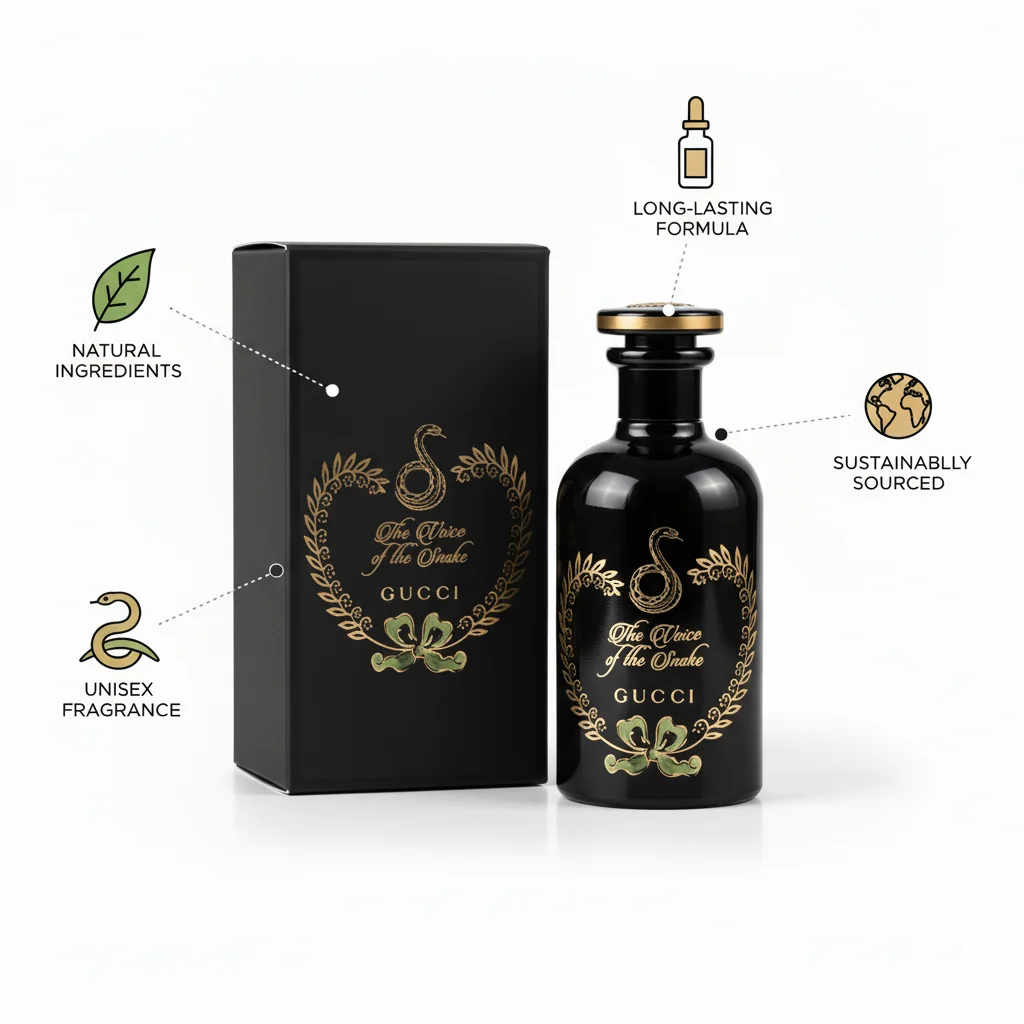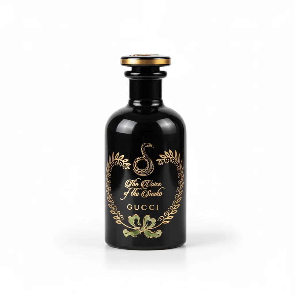 Gucci The Alchemist’s Garden The Voice of the Snake is an exquisite and mysterious Eau de Parfum from Gucci’s Haute Perfumery collection, launched in 2019. Inspired by the science of alchemy and a fantastical garden, each fragrance in this collection is designed to be layered and blended, allowing for a truly personalized scent journey. “The Voice of the Snake” is a powerful and captivating scent, centered around the intense and enchanting aroma of Oud. It evokes the mystical allure of a snake moving through a deep, dark forest, leaving a hypnotic trail. The fragrance masterfully blends precious Oud with earthy and resinous notes of Patchouli and rich, creamy Saffron. This combination creates a deep, warm, and animalistic aroma that is both intriguing and luxurious. The scent is designed to be genderless, appealing to anyone who appreciates complex, woody, and exotic fragrances. The opulent black lacquered glass bottle, adorned with a golden snake motif and intricate floral details, reflects the preciousness and artistry of the elixir within, reminiscent of vintage apothecary jars.
