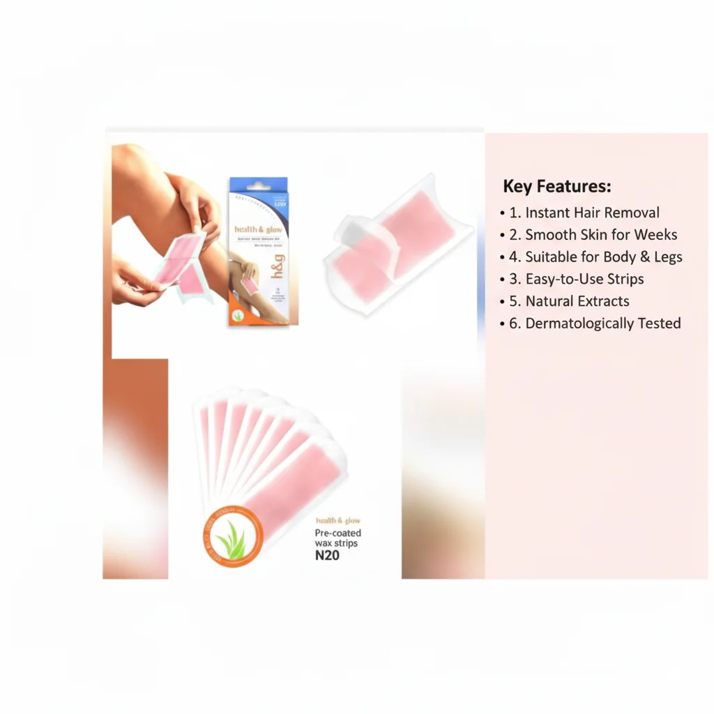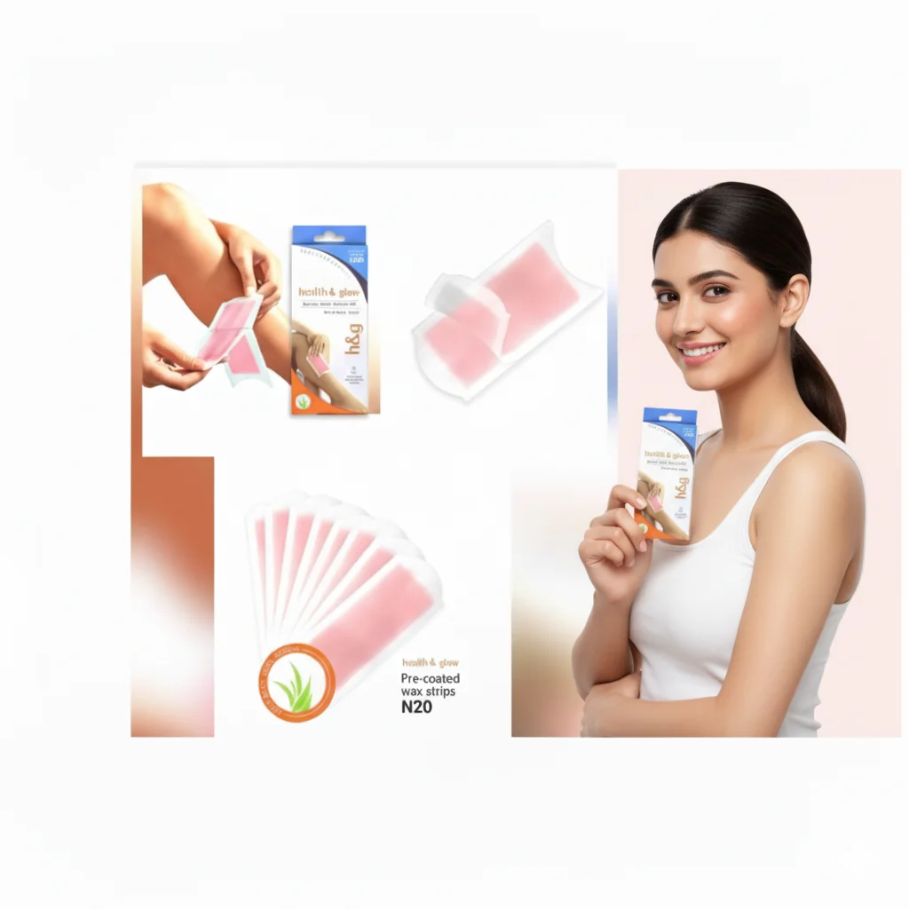 The Health & Glow Pre-coated Wax Strips are a convenient and easy-to-use solution for at-home hair removal. The product packaging, a blue and orange box, highlights its ease of use (“perfect home salon finish”) and includes a visual of a woman applying a wax strip to her leg, demonstrating its intended use. Inside, the product consists of multiple pink, pre-coated wax strips, which are ready to use right out of the box, eliminating the need for heating wax separately. The image also shows a quantity of “N20,” likely referring to 20 individual strips or 10 double-sided strips. A woman smiling and holding the product reinforces its appeal as an accessible beauty solution. The presence of a small green emblem with what appears to be a plant suggests the inclusion of natural or skin-friendly ingredients, possibly soothing agents to minimize irritation.