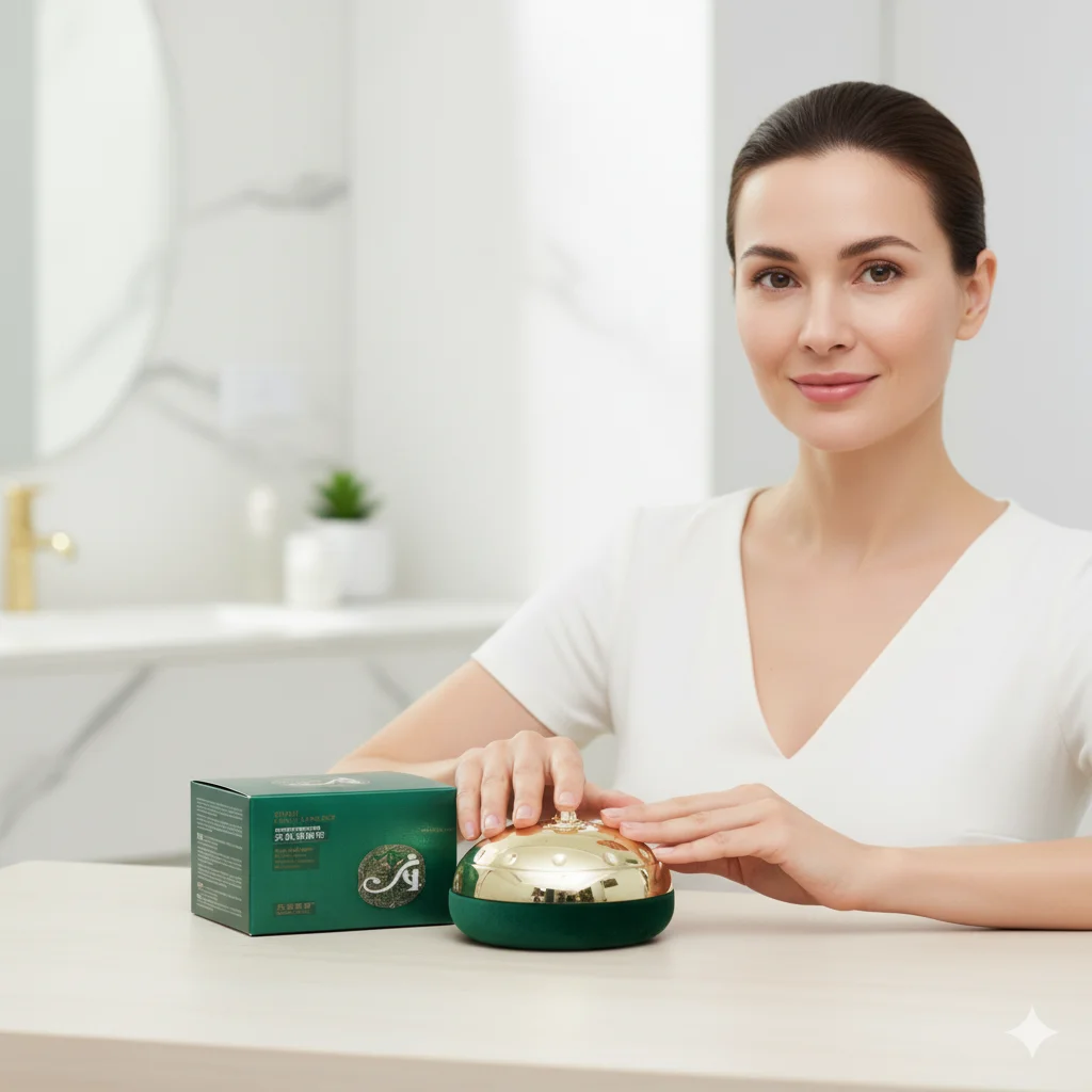 Elegant Packaging: It comes in a distinctive and luxurious green and gold jar.