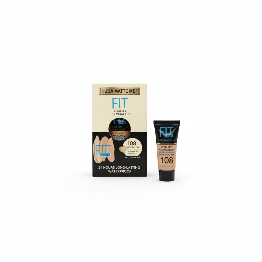 The HUDA MATTE ME FIT Vitality Foundation is a long-lasting, waterproof liquid foundation designed to provide full coverage and a matte finish. This specific product is in Shade 108. The packaging highlights its ability to last for 24 hours, making it suitable for extended wear. The product comes in a small, squeezable tube, accompanied by a box that details its features.