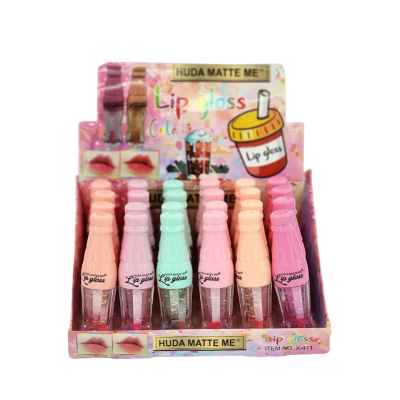 This product is a charming and playful display set featuring “HUDA MATTE ME” brand lip glosses, uniquely packaged in miniature soda bottle-shaped containers. The display box itself is designed with fun, beverage-themed graphics, including illustrations of a soda cup with “lip gloss” written on it and what appears to be a slushie or milkshake. The lip glosses come in an assortment of pastel colors – predominantly pink, peach, and mint green – suggesting different “cola” or drink flavors, appealing to a younger demographic or those who appreciate novelty makeup. Each bottle contains a clear lip gloss with visible glitter particles, indicating a shimmering or sparkling finish. The overall presentation is bright, colorful, and makes for an eye-catching retail item.