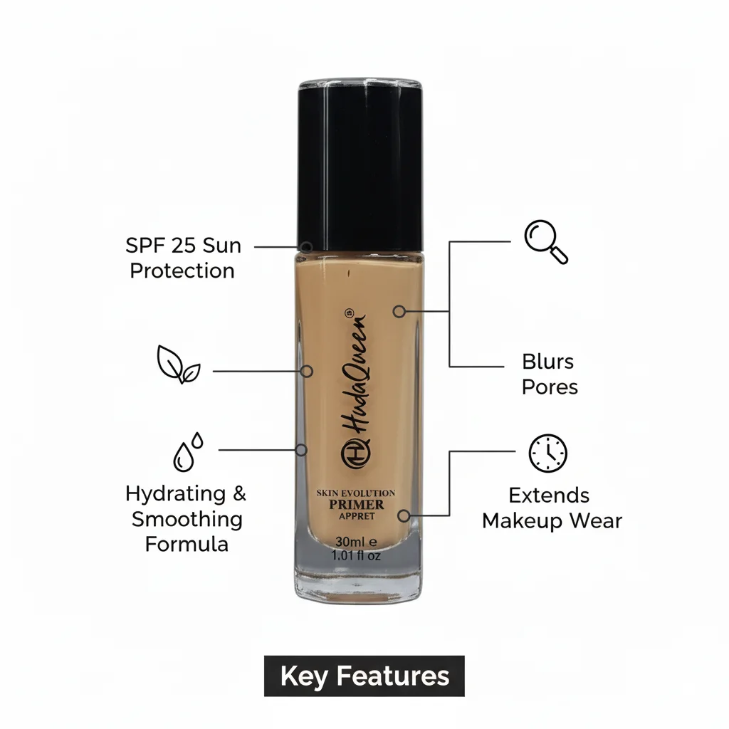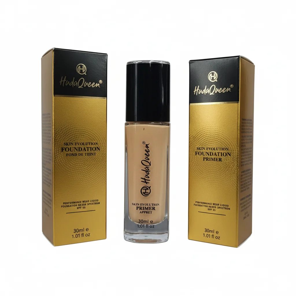 The HudaQueen Skin Evolution Foundation & Primer is a dual-purpose beauty product designed to create a flawless complexion. This set includes a liquid foundation and a matching primer, both housed in elegant black and gold packaging. The “Skin Evolution” line suggests a formula aimed at improving skin’s appearance and wear throughout the day.