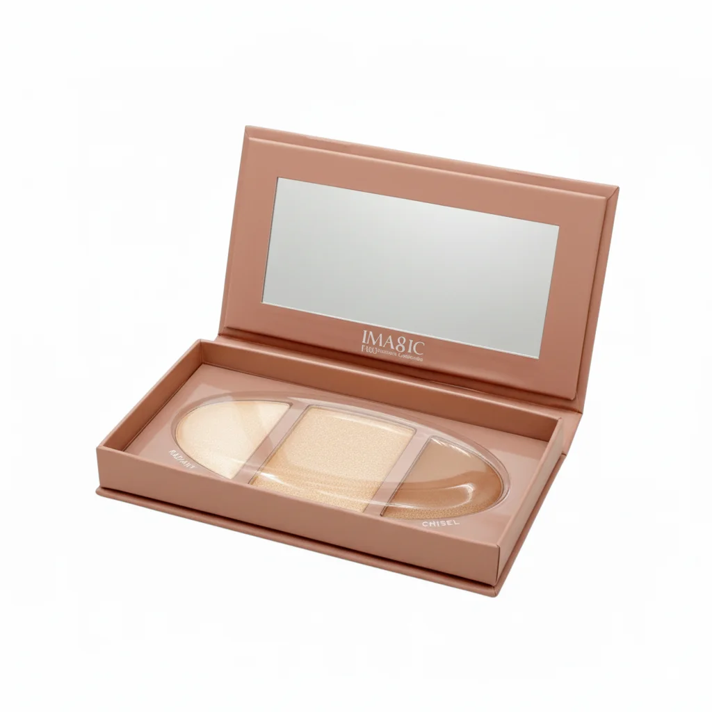 This product is a “Tough” themed highlight and contour palette from IMAGIC PROfessional Cosmetics. The palette comes in a rectangular, warm-toned beige or light brown cardboard compact with a mirror inside the lid. The interior features three distinct, elongated oval pans of product, arranged side-by-side. These shades appear to be finely milled powders, likely consisting of a lighter highlight shade, a slightly deeper highlight or subtle shimmer, and potentially a soft contour or bronzing shade, all within a luminous or shimmery finish. The outer packaging, a matching cardboard box, features the IMAGIC logo along with the word “Tough” in a stylized, almost graffiti-like script, surrounded by a wavy, liquid-like graphic. Below “Tough,” it specifies “HIGHLIGHT & CONTOUR.” The overall aesthetic suggests a product designed for creating defined and illuminated facial features with a touch of edge.