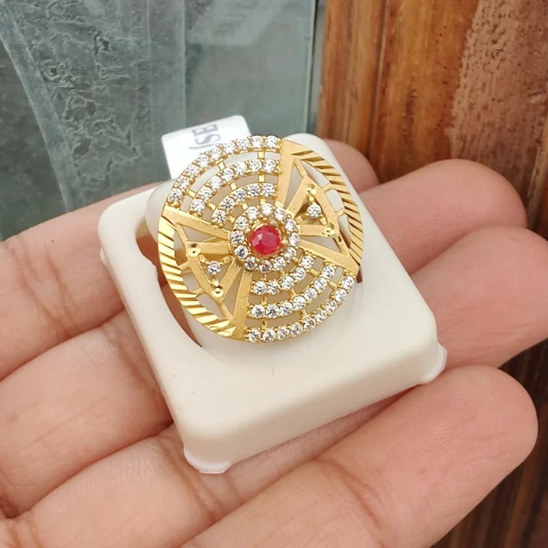 Make a bold statement with this exquisitely designed gold-plated ring, featuring a sophisticated sunburst or mandala-inspired circular face. At the center of this striking piece is a brilliant, faceted ruby-red stone that serves as a vibrant focal point. Radiating from the center are alternating layers of polished gold “spokes” and shimmering arcs of precision-set white crystals, creating a magnificent display of light and texture.