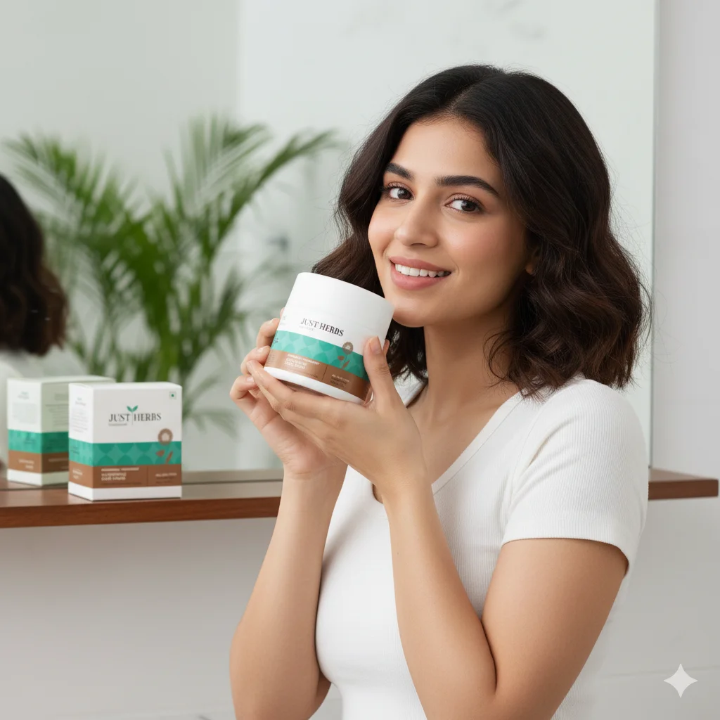 Brand: Just Herbs Haircare, emphasizing natural and herbal hair solutions.