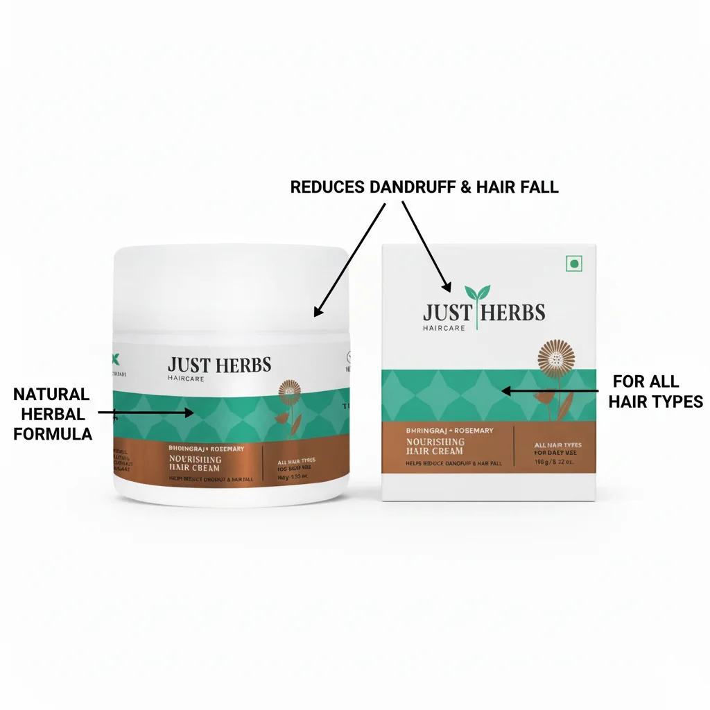 The Just Herbs Bhringraj + Rosemary Nourishing Hair Cream is a specialized haircare treatment designed to promote scalp health and reduce common hair concerns. Infused with the traditional goodness of Bhringraj, known for its hair strengthening properties, and Rosemary, recognized for stimulating hair growth and improving scalp circulation, this cream offers comprehensive nourishment. It is specifically formulated to help reduce dandruff and hair fall, making it an ideal choice for individuals seeking to improve their hair’s overall vitality and appearance. Suitable for all hair types and gentle enough for daily use, this cream deeply conditions the hair, leaving it soft, manageable, and less prone to breakage. The product is presented in a practical jar, accompanied by a square carton box featuring the elegant Just Herbs branding with botanical motifs.