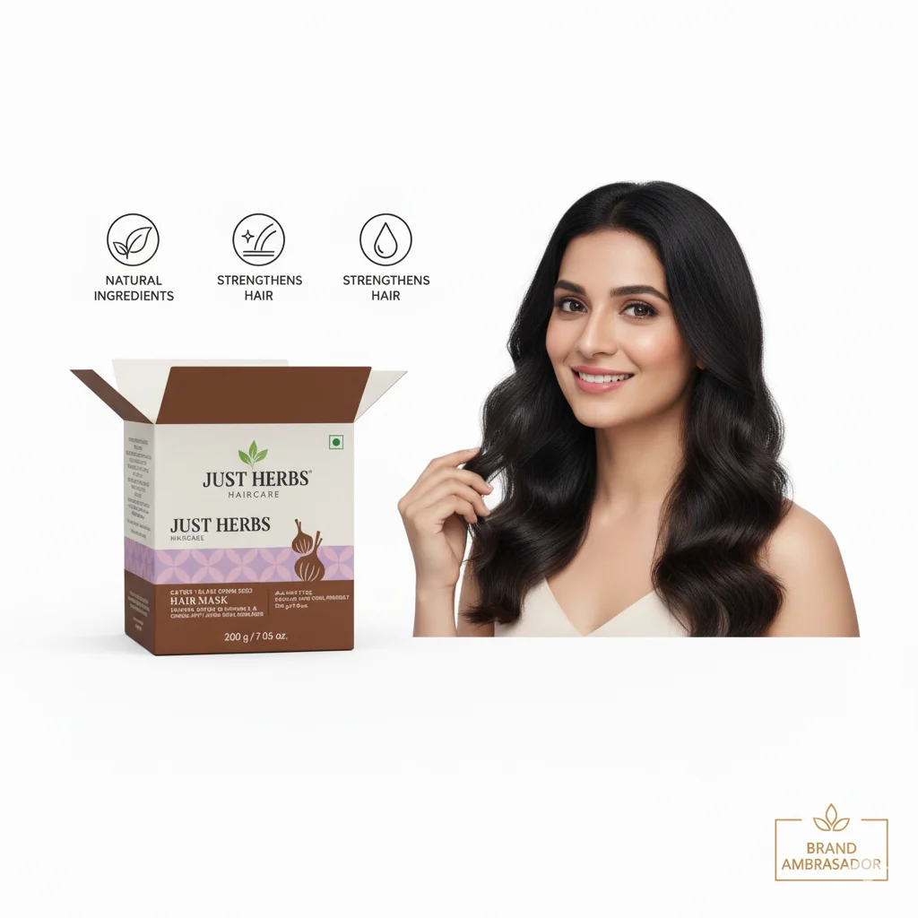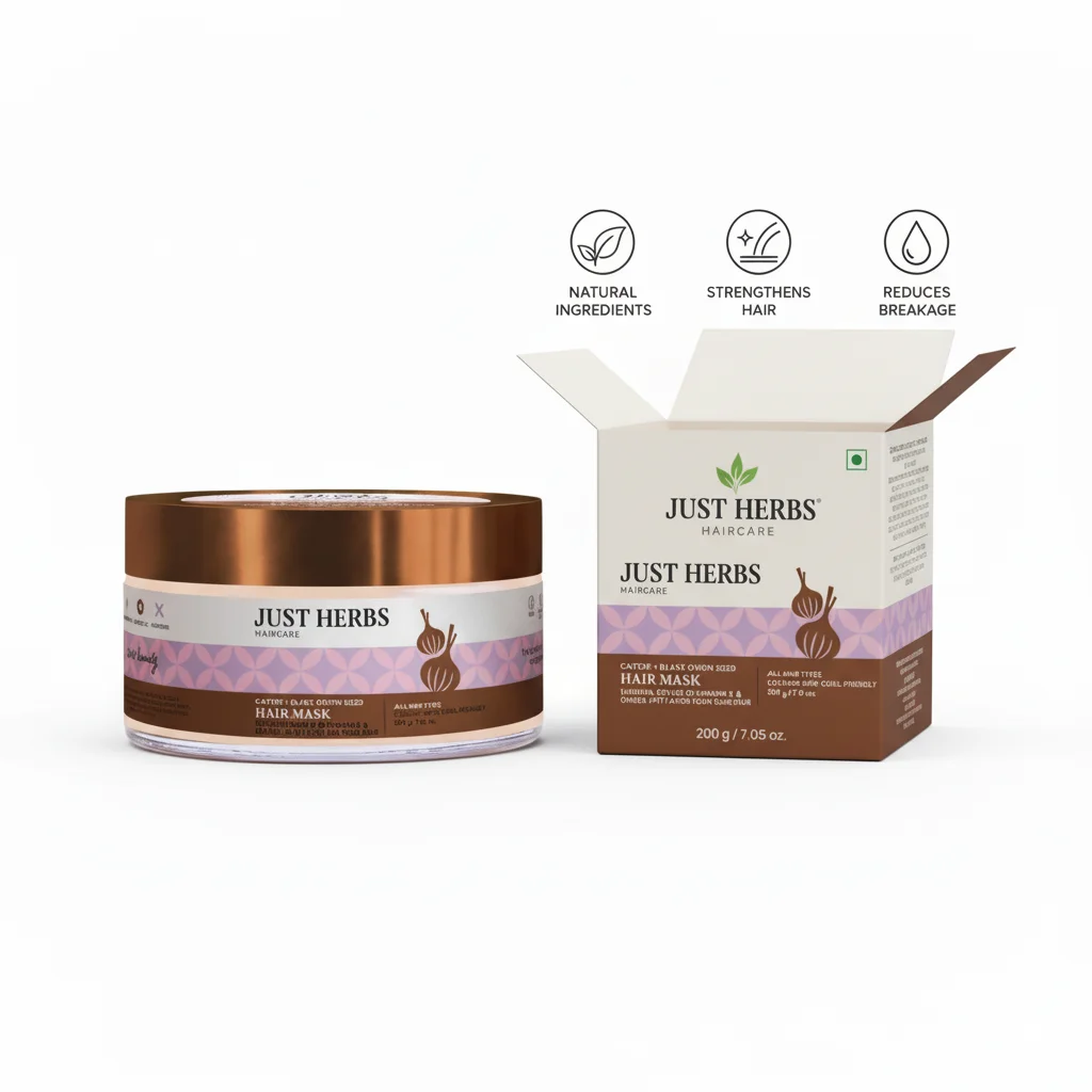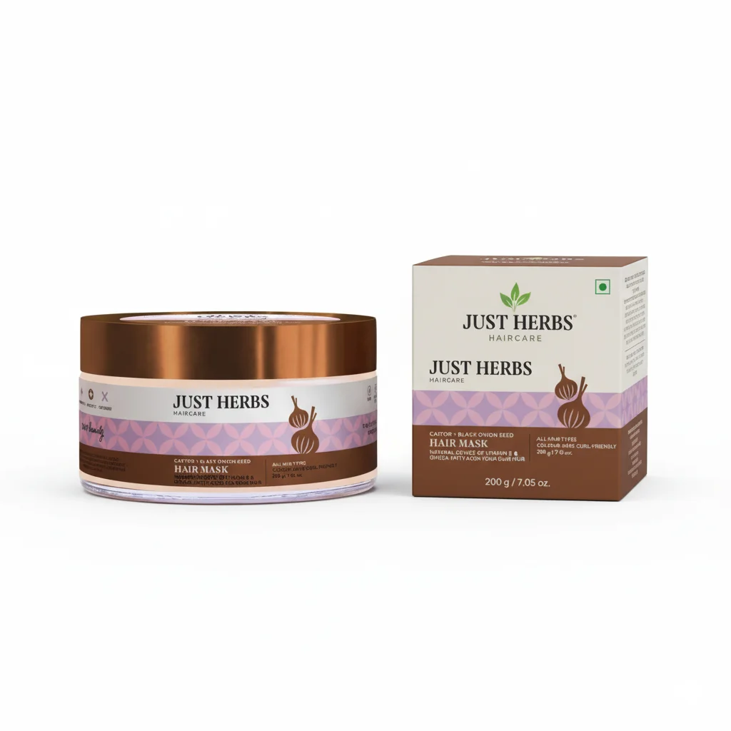 Experience an at-home spa treatment with the Just Herbs Castor & Black Onion Seed Hair Mask, a deep-conditioning formula designed to tackle a range of hair concerns including dandruff, dryness, frizz, dullness, and hair fall. This mask is formulated with nourishing ingredients revered in Ayurveda, such as Castor Oil, known for promoting hair health, and Black Onion Seed (Kalonji), which helps encourage hair growth while adding luster and shine. By rinsing away scalp build-up, it paves the way for healthier hair growth. This luxurious and nourishing mask works to revitalize your hair, leaving it stronger, healthier, and visibly more lustrous.