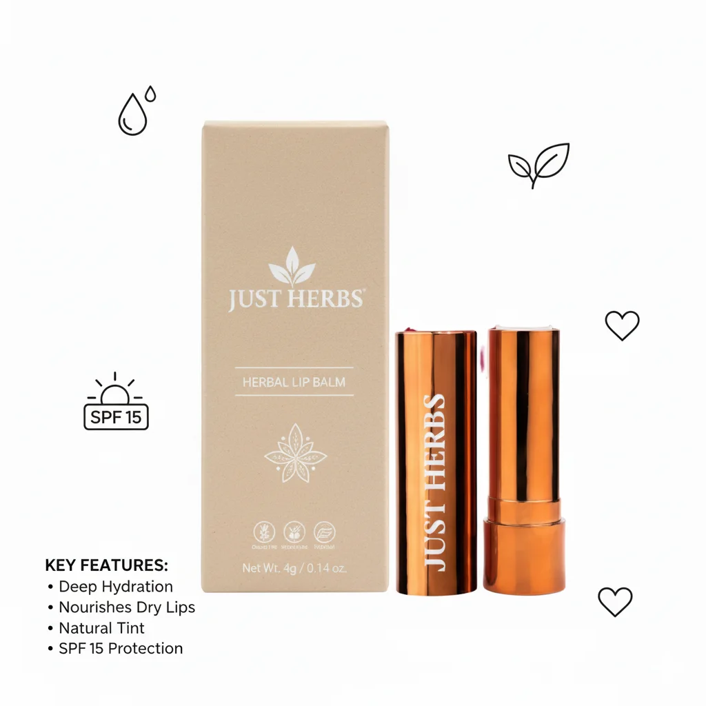 Confidently flaunt a plump, soft, and healthy pout with the Just Herbs Herbal Tinted Lip Balm. This lip balm is expertly formulated with a nourishing blend of natural oils and butters to provide deep hydration while adding a subtle, beautiful tint. Designed for daily use, it works to repair chapped lips, reduce pigmentation, and seal in moisture, leaving your lips feeling soft and luscious. Additionally, it offers crucial sun protection with SPF 20+, shielding the delicate skin on your lips from harmful UV rays to prevent sun damage and the formation of wrinkles.This lip care essential is crafted with herbal ingredients, making it a gentle and safe choice for all skin types. It is available in several ‘lip-smacking’ flavors, each providing a unique, dewy tint.