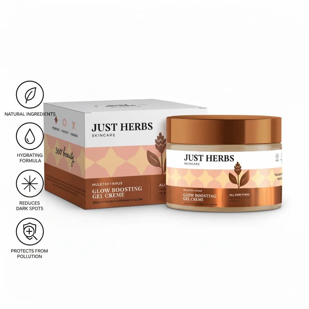 Experience a radiant complexion with the Just Herbs Mulethi & Khus Glow Boosting Gel Crème. This lightweight, fast-absorbing gel moisturizer is formulated with a blend of Ayurvedic ingredients including Mulethi (Liquorice Root), Khus (Vetiver), Aloe Vera, and Cucumber. Designed to promote clearer, brighter, and more even-toned skin, it works to reduce the appearance of dark spots and blemishes while sealing in moisture for a luminous finish. Mulethi is known for its skin-brightening properties that help diminish dark spots and pigmentation, while Khus provides intense moisture and helps to control oil production. This cream aims to boost collagen, resulting in firmer and softer skin. It is consciously crafted to be free from parabens and is cruelty-free.