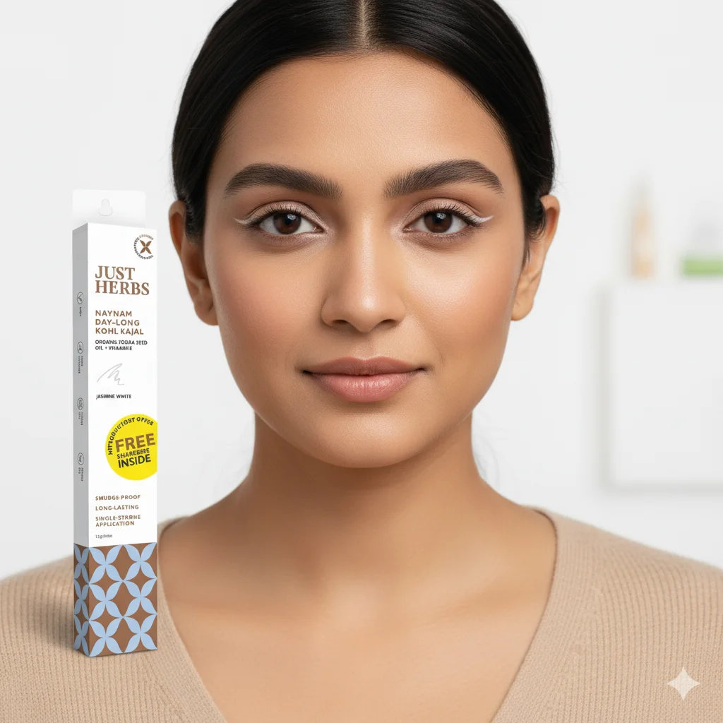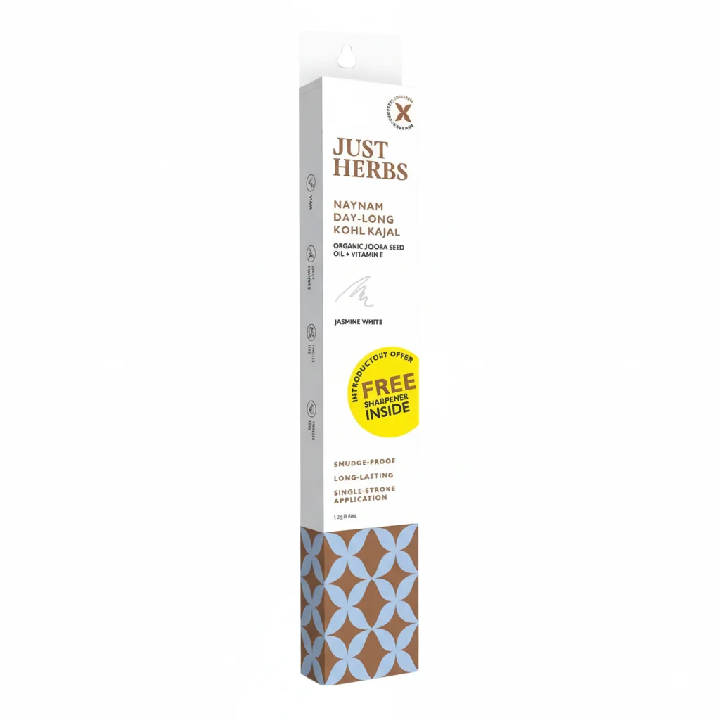 It’s an organic kohl kajal enriched with jojoba seed oil and Vitamin E. The packaging highlights an introductory offer of a free sharpener inside. It promises to be smudge-proof, long-lasting, and designed for single-stroke application. The brand, “Just Herbs,” is indicated to be cruelty-free and natural. The net weight is 1.2g/0.04fl.oz. The bottom of the packaging features a decorative blue and brown pattern.