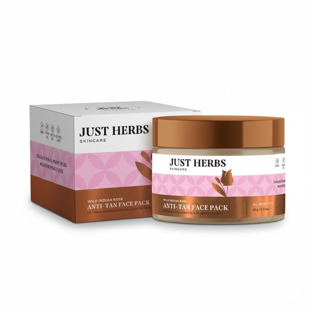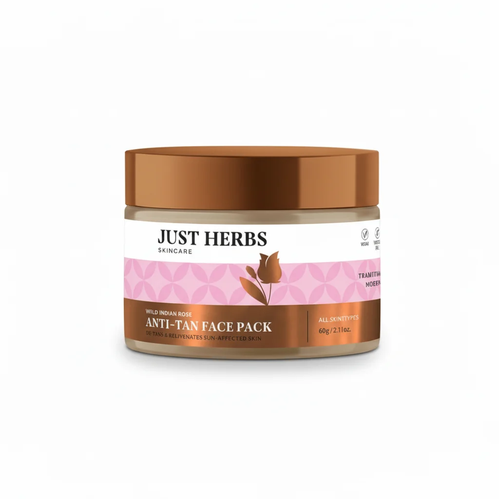 The JUST HERBS Anti-Tan Face Pack is a specialized skincare treatment designed to detan and rejuvenate sun-affected skin, making it suitable for all skin types. This face pack comes in a 60g (2.11 oz) jar, adorned with packaging that highlights its key ingredient: Wild Indian Rose. Rose is renowned in traditional skincare for its soothing, toning, and brightening properties. The product’s primary function is to help reverse the effects of sun exposure, reduce tanning, and revitalize skin that has been damaged or dulled by the sun. It aligns with the brand’s commitment to “Traditional Principles” and “Modern Practices,” likely indicating a blend of ancient herbal wisdom with contemporary formulation techniques. The presence of “Vegan” and “Cruelty-Free” certifications on the packaging further underscores the brand’s ethical and natural approach to skincare.fac