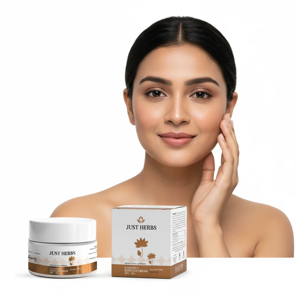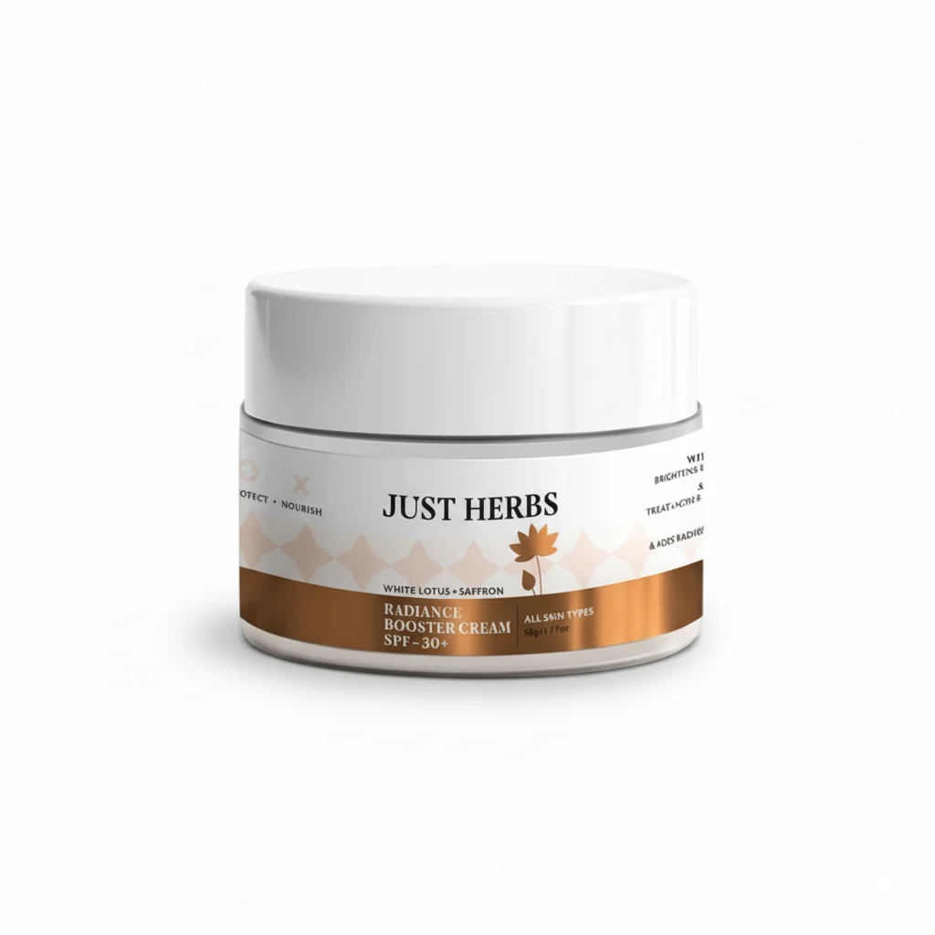 The Just Herbs White Lotus + Saffron Radiance Booster Cream is an enriching skincare product designed to nourish the skin while boosting its natural radiance. This cream is formulated with potent natural ingredients such as White Lotus and Saffron, both known for their skin-brightening and rejuvenating properties. It also includes SPF 30+ to provide essential protection against harmful UV radiation, making it suitable for daily use. The cream aims to deeply moisturize the skin, improve its texture, and impart a healthy, radiant glow. It’s suitable for all skin types and comes in an elegant jar, presented alongside its matching box that highlights the key ingredients and benefits.