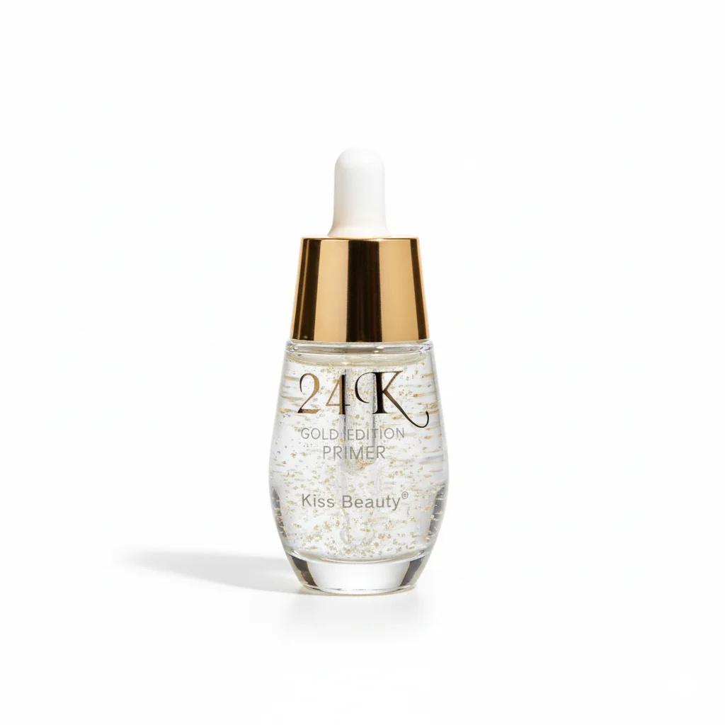 The Kiss Beauty 24K Gold Edition Primer is a luxurious face primer designed to prepare your skin for makeup application while adding a touch of radiance. This exquisite product is housed in a clear glass dropper bottle with a striking gold cap and a white rubber dropper bulb, giving it a premium aesthetic. The liquid inside is clear and visibly infused with numerous shimmering gold flakes, emphasizing its “24K Gold Edition” claim. The label clearly states “24K GOLD EDITION PRIMER” and “Kiss Beauty,” indicating both its key ingredient and brand. As a primer, it aims to create a smooth canvas for foundation, potentially minimizing pores and extending makeup wear, while the gold flakes suggest an illuminating and possibly nourishing effect for a glowing complexion.