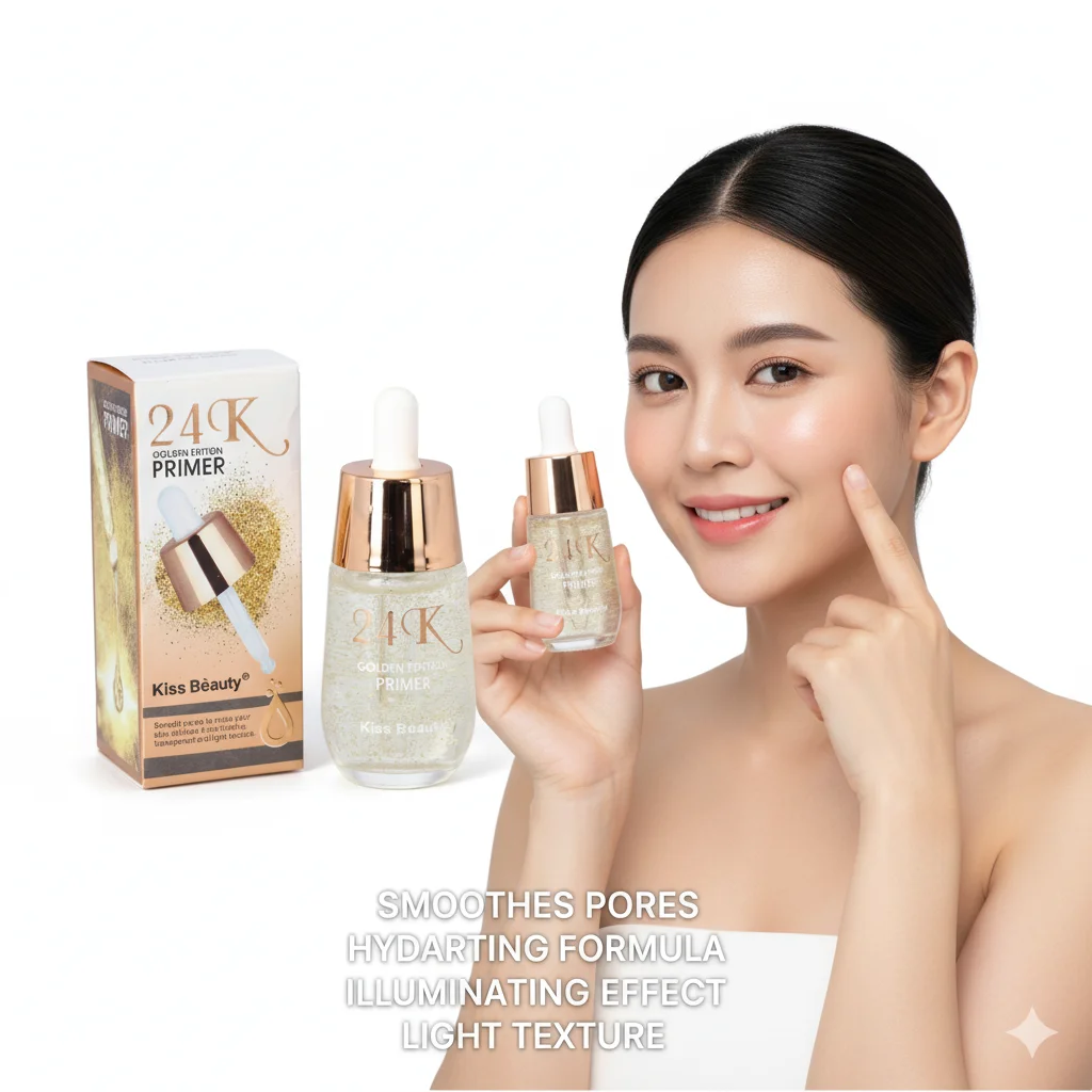 The accompanying box is white with gold accents and a sparkling gold background graphic. It prominently displays “24K GOLDEN EDITION PRIMER” and the “Kiss Beauty®” logo. An illustration of a dropper, similar to the product’s actual cap, is shown amidst gold glitter. Below this, there’s a text description that reads: “Smooth pores to make your skin delicate & moisturising, transparent and light texture.” The overall aesthetic emphasizes luxury, skin preparation, and a radiant, possibly glowing, finish.