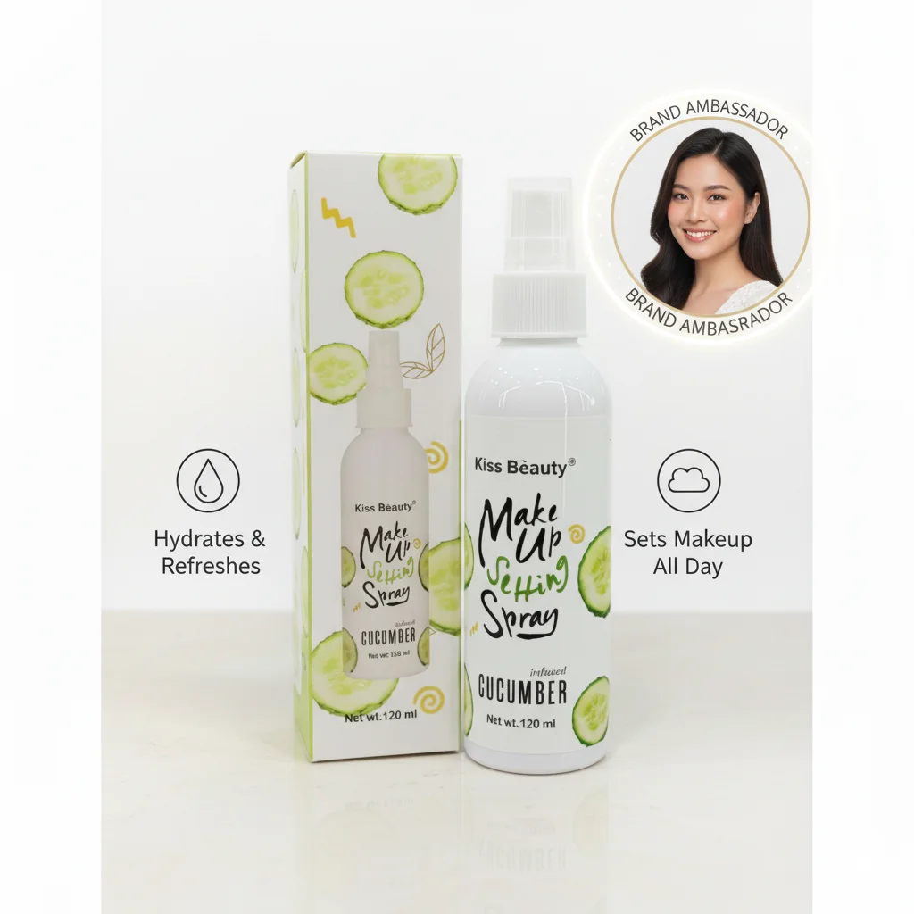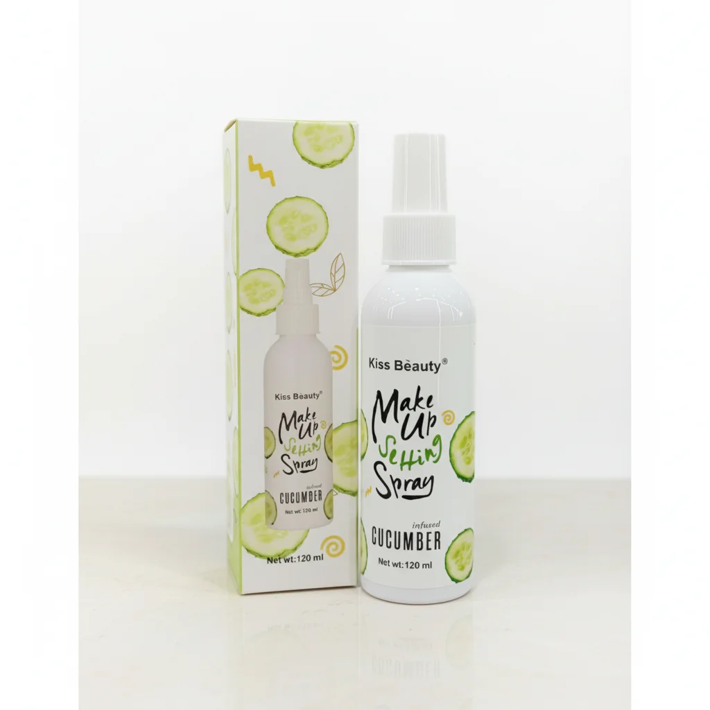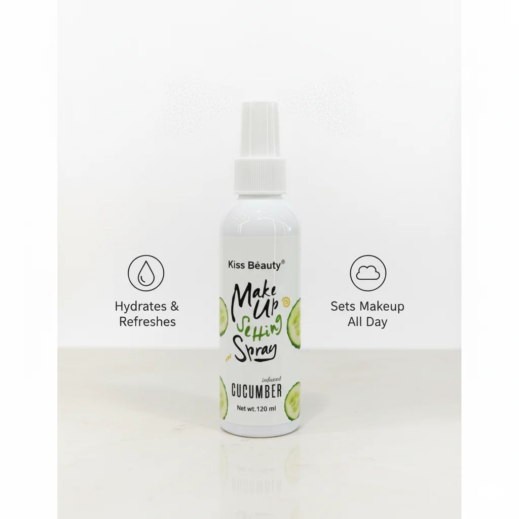 The Kiss Beauty Cucumber Infused Make Up Setting Spray is a refreshing and hydrating mist designed to set your makeup for a long-lasting, fresh finish. Enriched with natural cucumber extract, this spray not only helps to keep your makeup in place but also provides a cooling and soothing sensation to the skin. It works to prevent makeup from smudging, fading, or settling into fine lines, ensuring a flawless complexion throughout the day. The lightweight formula is quickly absorbed, leaving a dewy, non-sticky finish. Packaged in a crisp white bottle with playful cucumber slice graphics and a net content of 120 ml, this setting spray is perfect for those seeking a revitalizing boost for their skin and makeup.