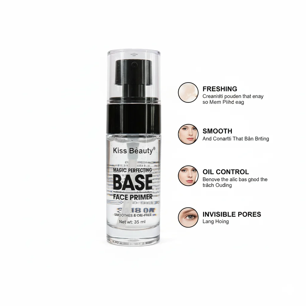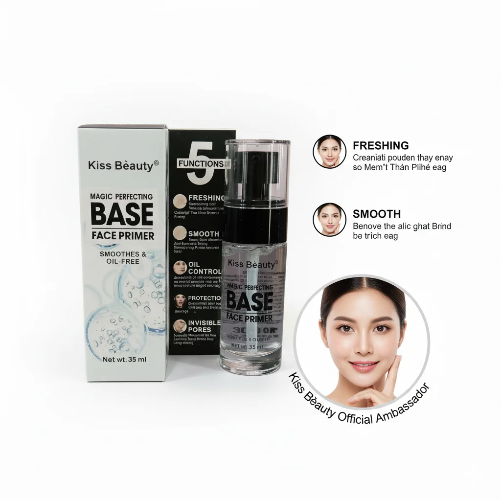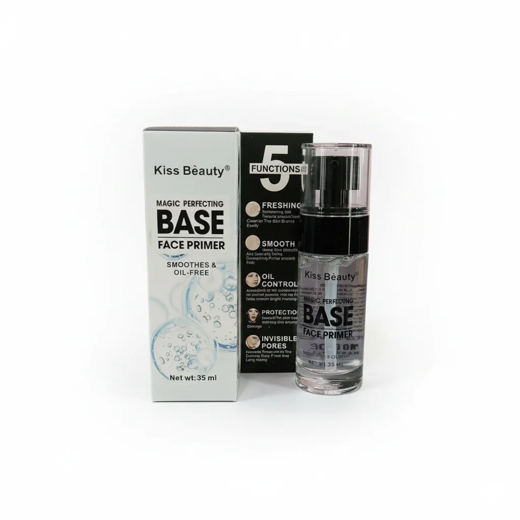 This product is the “Magic Perfecting Base Face Primer” from “Kiss Beauty.” It is designed as a pre-makeup base to prepare the skin and enhance makeup application and wear. The product boasts “5 FUNCTIONS,” which are detailed on the packaging: “FRESHING,” “SMOOTH,” “OIL CONTROL,” “PROTECTOR” (likely protection from makeup or environmental factors), and “INVISIBLE PORES.” It is also explicitly stated as “SMOOTHES & OIL-FREE,” indicating it aims to create an even, non-greasy surface. The primer comes in a clear glass bottle with a pump dispenser, containing 35ml of product. The outer packaging is a white and black box with a clean design.