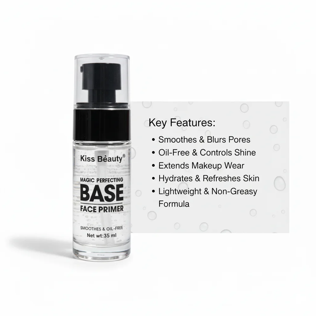 The Kiss Beauty Magic Perfecting Base Face Primer is an essential step in any makeup routine, designed to create a smooth, perfected canvas for foundation application. This primer is presented in a clear cylindrical bottle with a sophisticated black pump dispenser and a transparent cap, allowing the product inside to be visible. The formula appears to be a clear gel or serum, indicative of its “oil-free” claim. The label clearly states “Kiss Beauty” as the brand and “MAGIC PERFECTING BASE FACE PRIMER,” highlighting its key function. Below this, “SMOOTHES & OIL-FREE” emphasizes two crucial benefits: smoothing the skin’s texture and controlling oil, making it suitable for a range of skin types, particularly those prone to shine. The bottle contains a net weight of 35 ml, providing a good amount for regular use. This primer aims to minimize the appearance of pores, fine lines, and imperfections, ensuring makeup applies seamlessly and lasts longer.