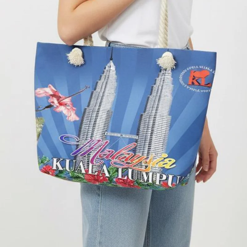 This oversized weekender tote bag features a bold, celebratory graphic design of Malaysia’s capital. The central focus is the iconic Petronas Twin Towers, set against a vibrant blue radial sunburst background that draws the eye. The design is accented with pink and red hibiscus flowers—the national flower of Malaysia—symbolizing the country’s natural beauty and tropical warmth. In the top right corner, the well-known “I Love KL” heart logo is featured, while the bottom of the bag is labeled with “Malaysia” in a vibrant script and “Kuala Lumpur” in bold white lettering.