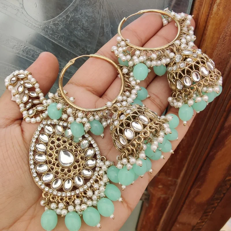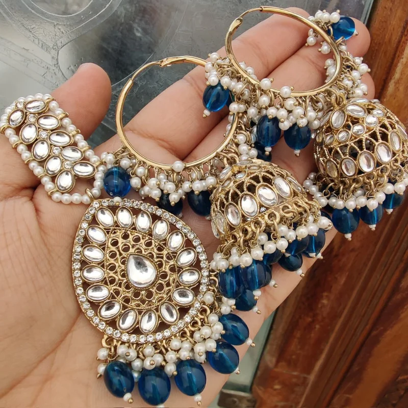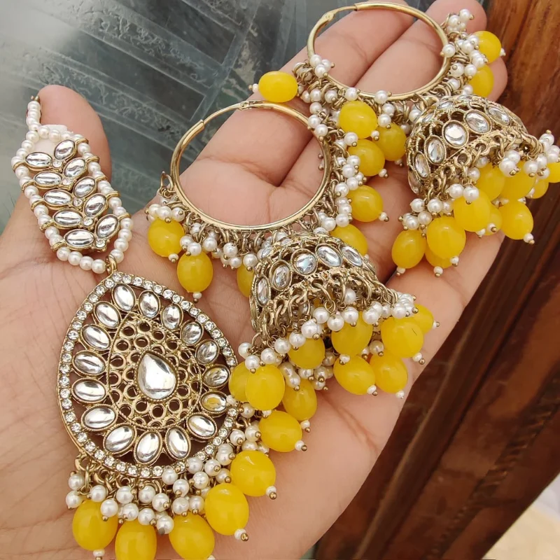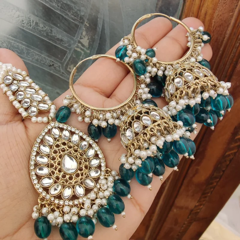 Complete 3-Piece Set: Includes one pair of hoop-jhumka earrings and a coordinating Maang Tikka.