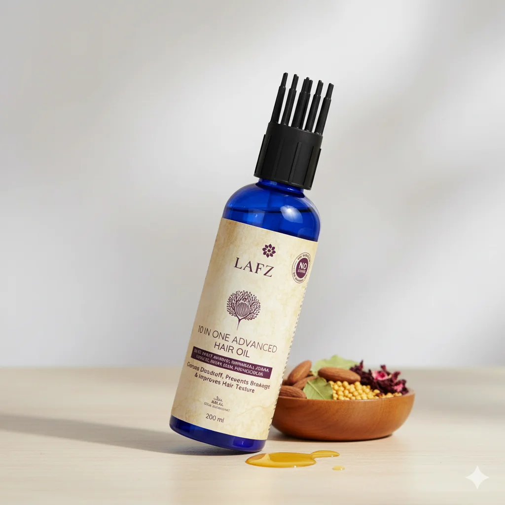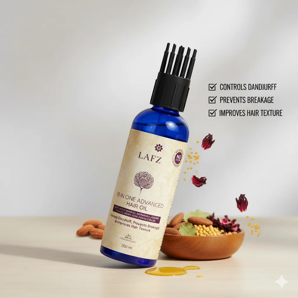 Unlock the secret to comprehensive hair care with LAFZ 10-in-1 Advanced Hair Oil. This powerful, multi-benefit formula is designed to address a wide array of hair concerns, from controlling dandruff and preventing breakage to significantly improving overall hair texture. Infused with a blend of ten potent ingredients (likely including the ones visually implied like almonds, mustard seeds, and hibiscus, as well as others), this oil works synergistically to nourish the scalp, strengthen hair follicles, reduce hair fall, and add a natural luster. The integrated applicator comb ensures easy and mess-free application, allowing for deep penetration and optimal results. Suitable for all hair types, this Halal-certified hair oil is your go-to solution for healthy, beautiful, and manageable hair.