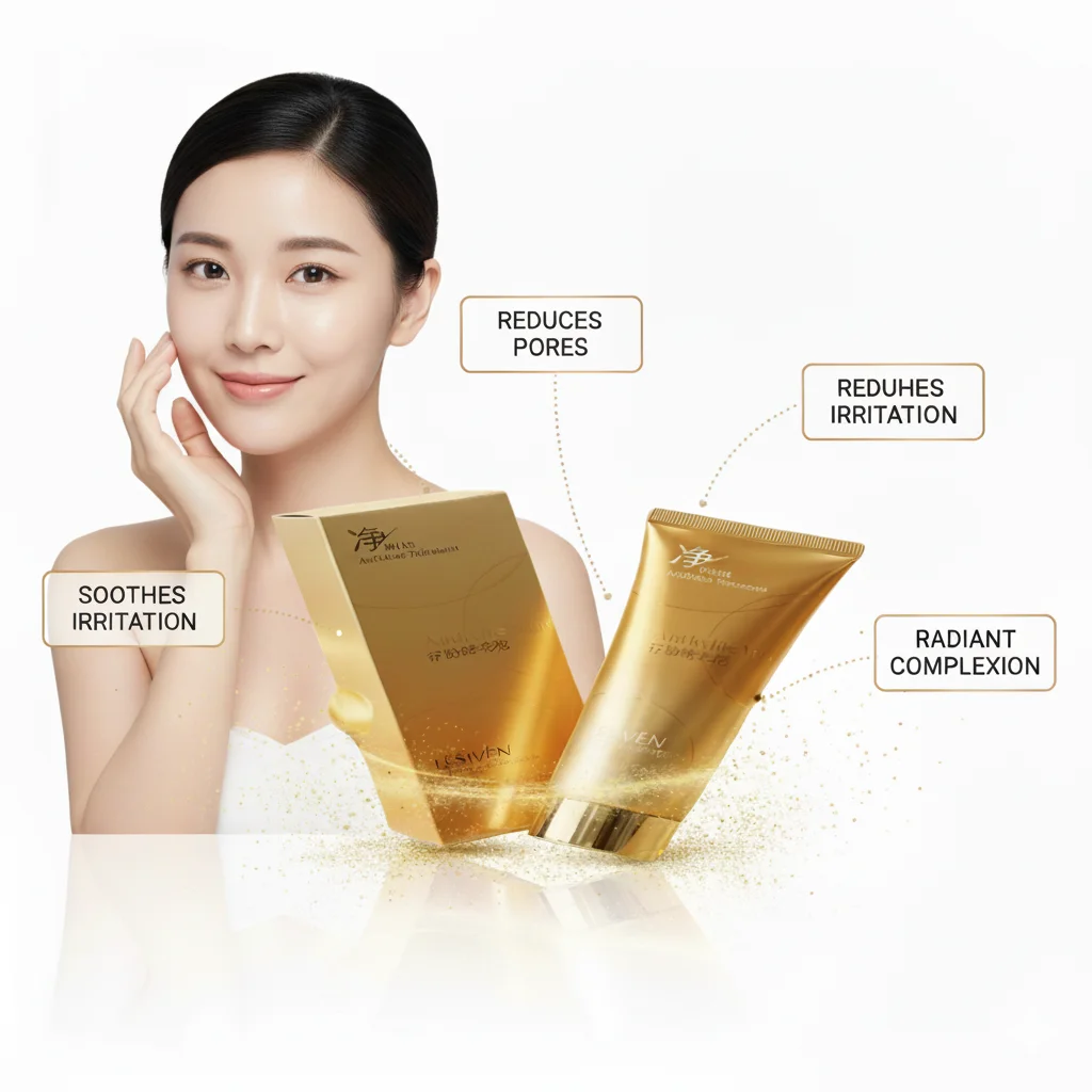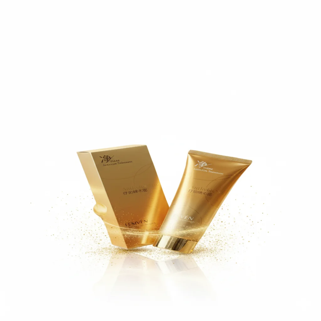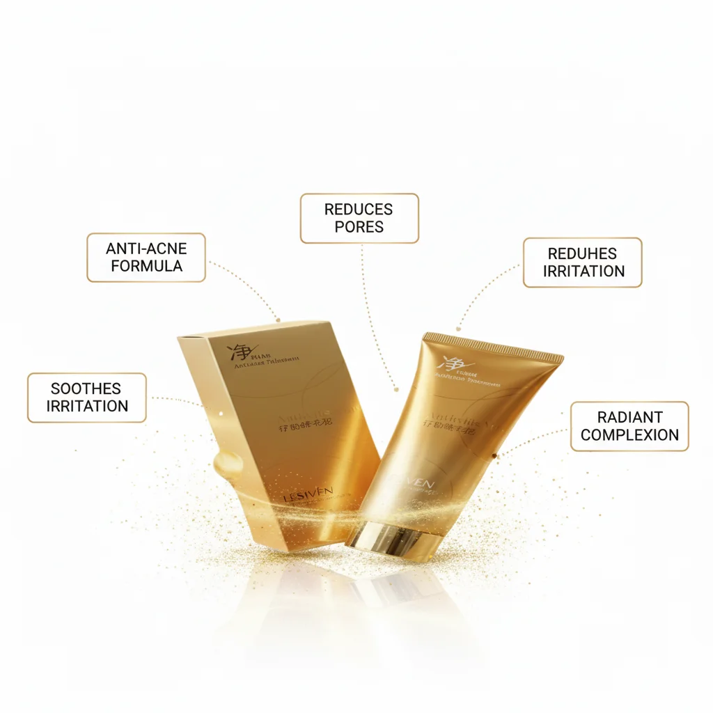 The product shown is the LESIVÉN Anti-Acne Treatment, a skincare solution presented in luxurious gold packaging that includes a tube and a matching box. The Chinese characters on the packaging, (Jìng Yán Qū Dòu), translate to “Purifying and Acne-Removing,” indicating its primary function is to cleanse the skin and combat acne breakouts. The sophisticated and premium appearance suggests a high-quality formulation designed to address acne-related skin concerns while offering a gentle and pleasant user experience. It is likely formulated as a facial cleanser or a targeted treatment cream to help reduce blemishes, control excess oil, and promote a clearer, healthier-looking complexion.