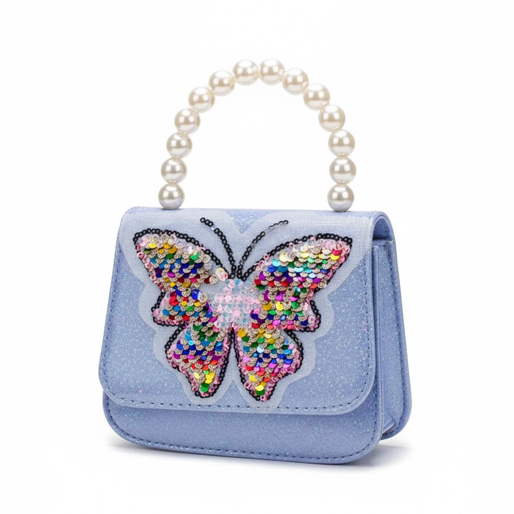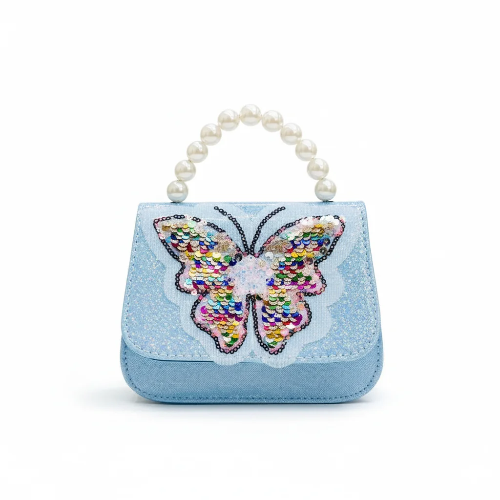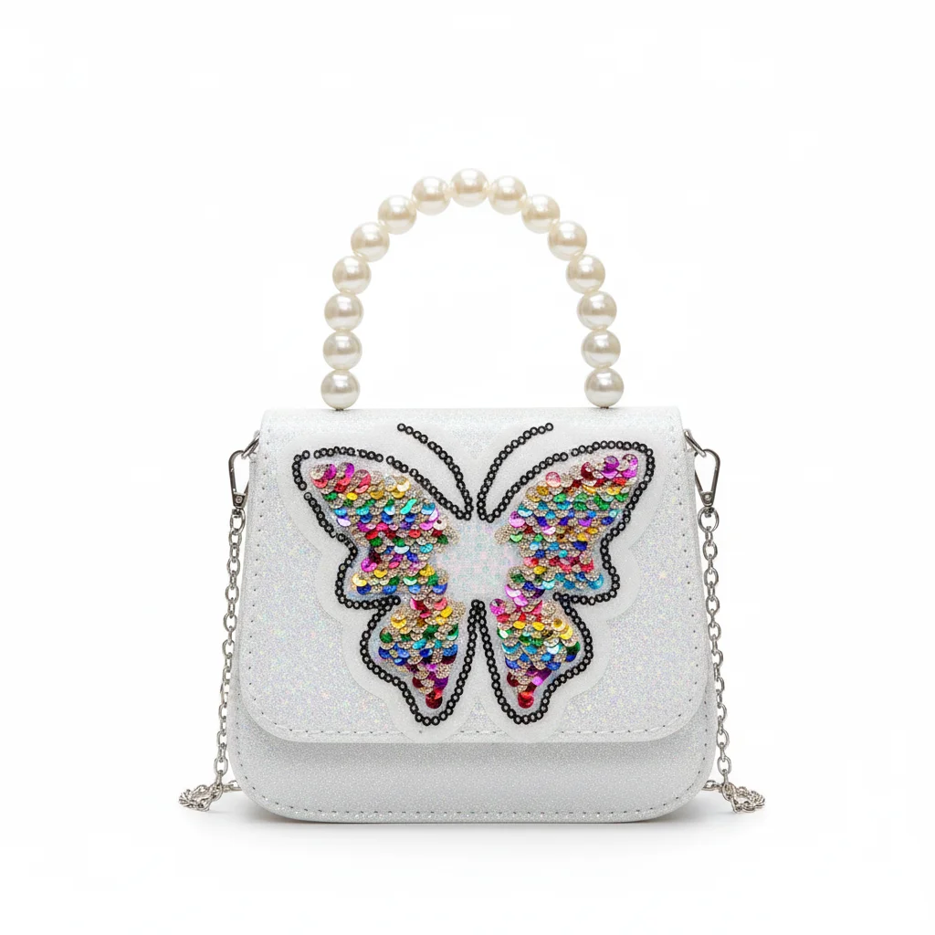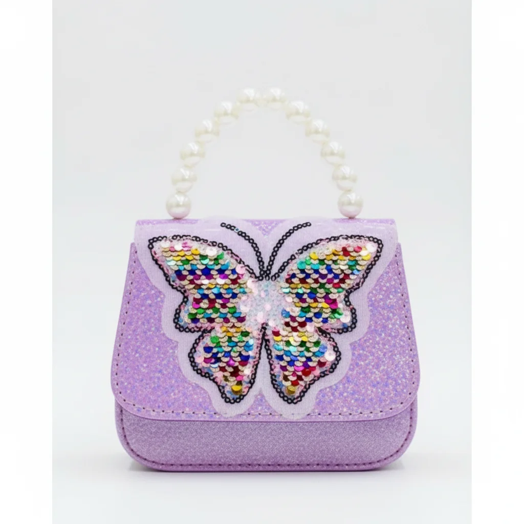Little Girls’ Radiant Glitter Butterfly Purse with Rainbow Sequins & Pearl Handle