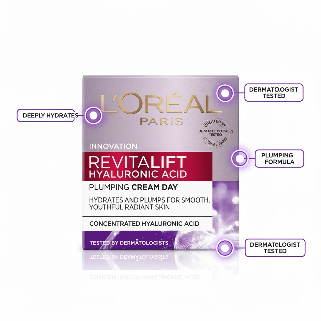 The L’Oréal Paris Revitalift Hyaluronic Acid Plumping Day Cream is a preventative anti-aging moisturizer designed to intensely hydrate and rejuvenate the skin. Formulated with a high concentration of hyaluronic acid, this cream deeply penetrates the skin to lock in moisture, restore elasticity, and promote a supple, youthful complexion. Its primary function is to plump the skin, which visibly reduces the appearance of fine lines and wrinkles. The lightweight gel-cream texture absorbs quickly without leaving a greasy or sticky residue, providing a sensation of hydrated, velvety skin. With daily use, it aims to leave the skin feeling refreshed, revitalized, and looking smoother and more radiant.