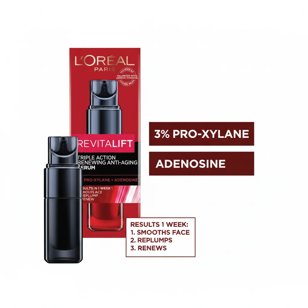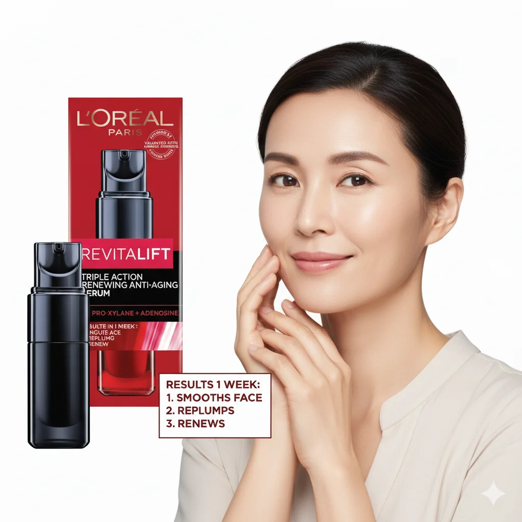 The L’Oréal Paris Revitalift Triple Action Renewing Anti-Aging Serum is an intensive treatment developed by L’Oréal Skincare Laboratories to dramatically improve skin quality. Inspired by dermatological procedures, this luxurious, lightweight serum is formulated with highly concentrated actives to provide fast and effective anti-aging benefits. It works to repair wrinkles, redensify the skin, and resurface skin texture for a comprehensive approach to combating aging. The formula is designed for rapid absorption to work on the skin’s surface and penetrate deeper layers. Immediately after application, skin texture is refined, feeling smoother and more supple, while fine lines and pores are less visible. With daily use, wrinkles are progressively reduced, skin regains its elasticity and plumpness, and the complexion appears brighter and more unified.