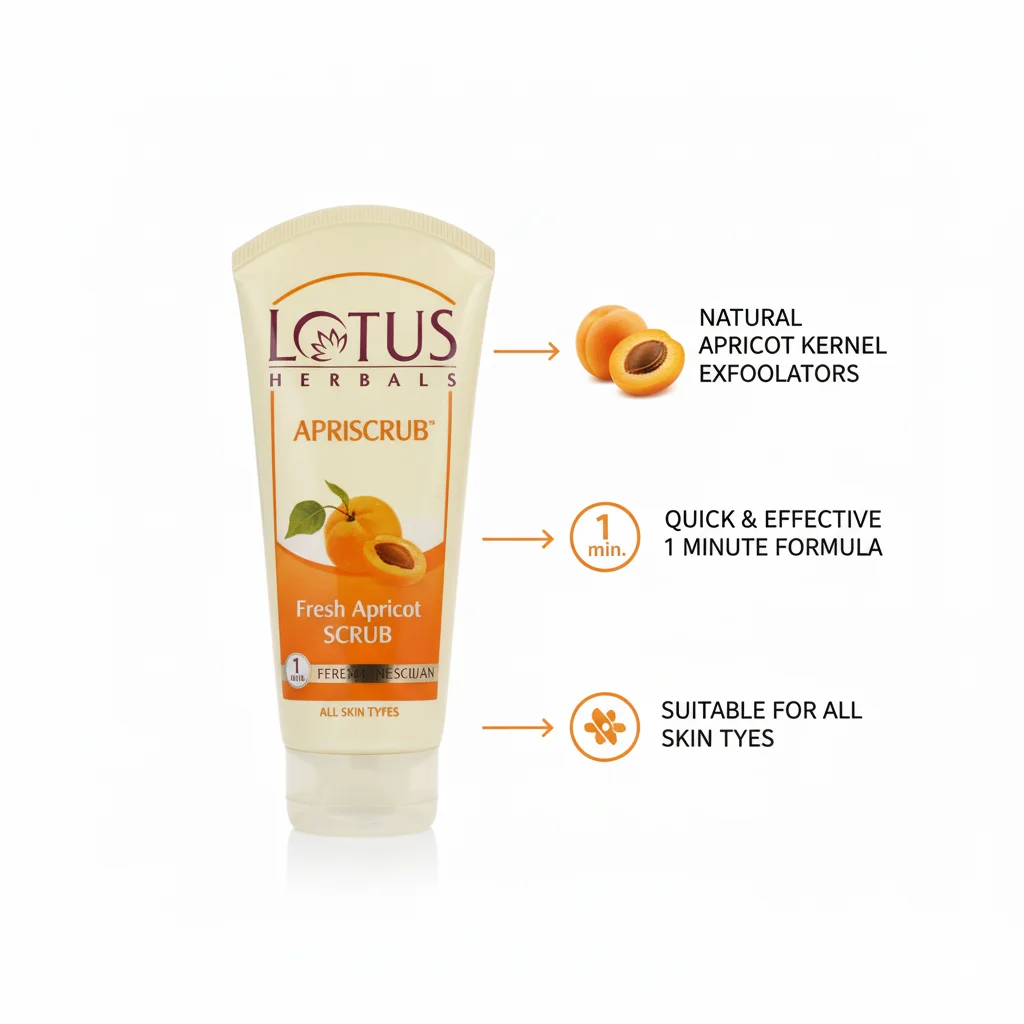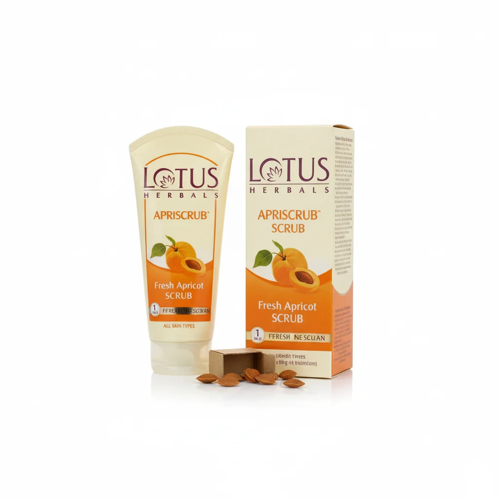 The Lotus Herbals Apriscrub Fresh Apricot Scrub is a facial exfoliator designed for “All Skin Types.” It comes in a light orange-beige tube with a flip-top cap, featuring an illustration of fresh apricots. The packaging emphasizes “Fresh Apricot Scrub.” The product is also shown with its corresponding outer carton, which mirrors the design of the tube. In the foreground, there are actual apricot kernels and what appears to be a small block of apricot-colored material, likely to highlight the natural ingredient. The scrub is formulated to gently exfoliate the skin, removing dead cells and impurities.