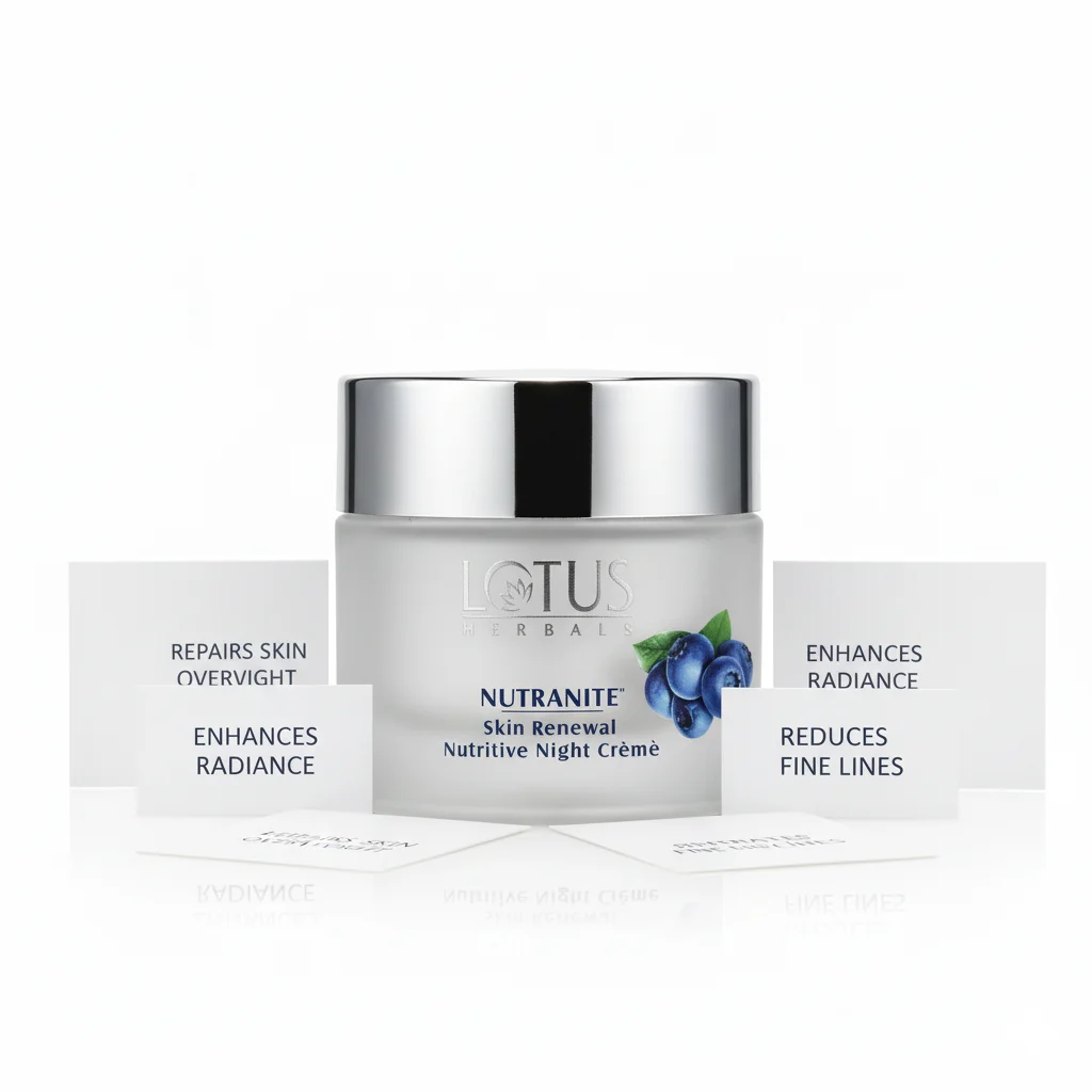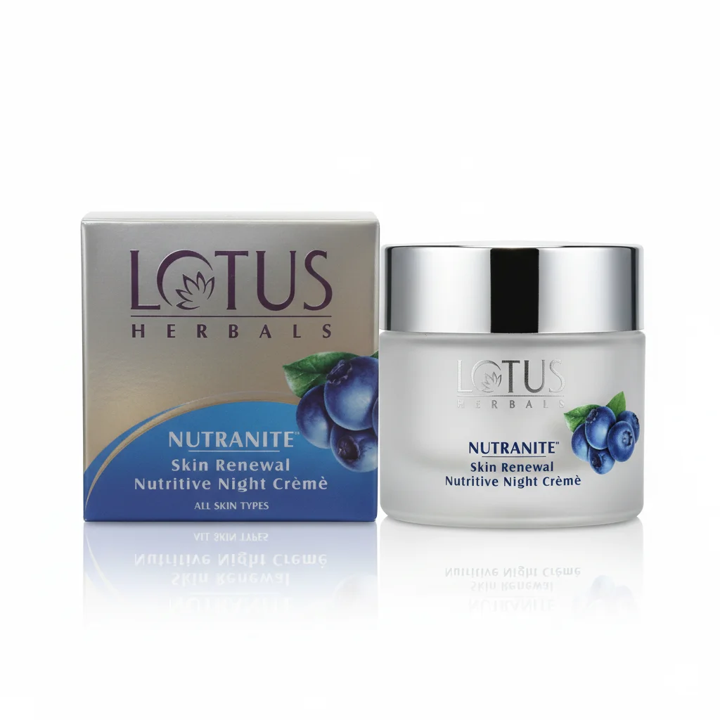 The image displays a jar and its corresponding box for “Lotus Herbals Nutranite Skin Renewal Nutritive Night Crème.” This product is a night cream designed for skin renewal and nourishment. The packaging features an illustration of blueberries, suggesting that blueberry extract or similar ingredients might be a key component, known for their antioxidant properties. The text “ALL SKIN TYPES” indicates its suitability for a broad range of users. The jar has a frosted glass appearance with a metallic silver lid, conveying a sense of quality and sophistication. The box shares a similar design, with a gradient of silver to blue, emphasizing its “Nutranite” (nutrition + night) purpose.